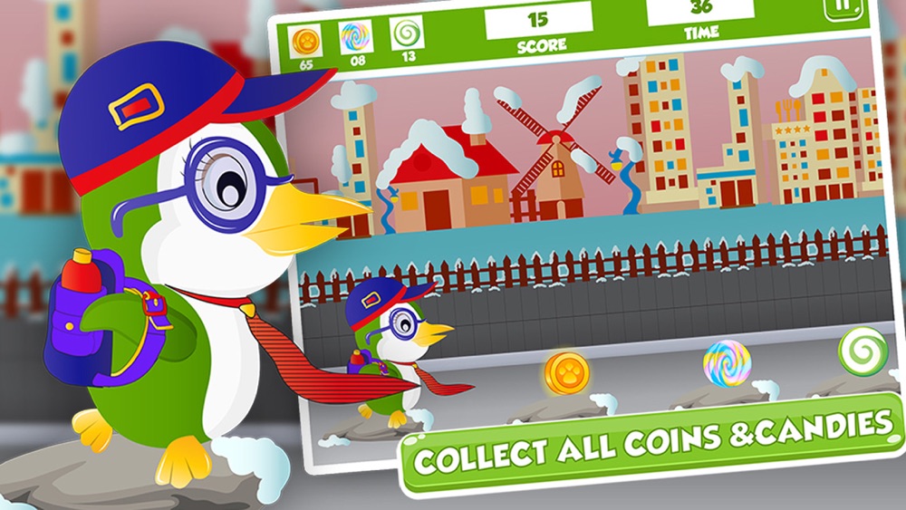 Baby penguin likes to eat candy, come help little penguin, jump, jump to get the more candies and coins! Tap to make the penguin jump from a stone to another stone.