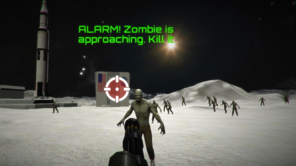 Your mission is to escape from the moon. But strangely, it is full of zombies. You need to kill them to survive while you try to solve how to operate the rocket.