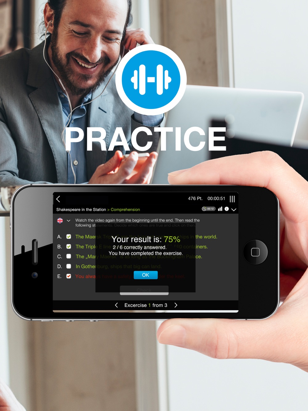 The papagei.com learning tools make learning easier. After logging in, you can directly start an online video course in your personal learning environment. Matching each video, you practice with digital pronunciation and grammar exercises. Interactive tests consolidate step by step your language skills and the digital online vocab coach expands your vocabulary.