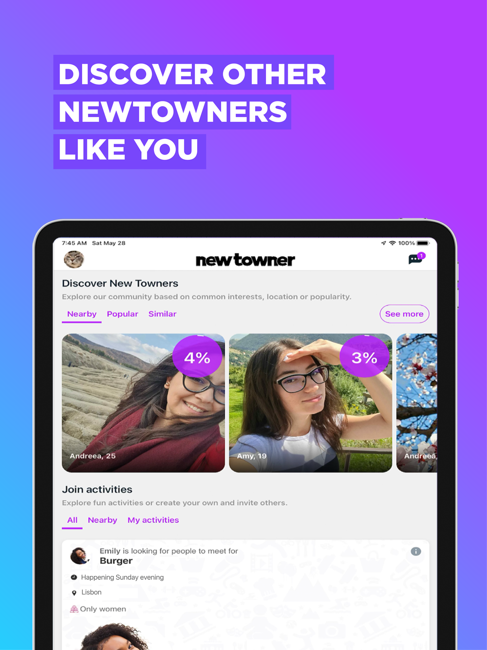 NewTowner is the first socializing & friendship app where you can meet new people nearby in fun, group activities. Here you can find new friends to go out with, explore the city and do what you love.