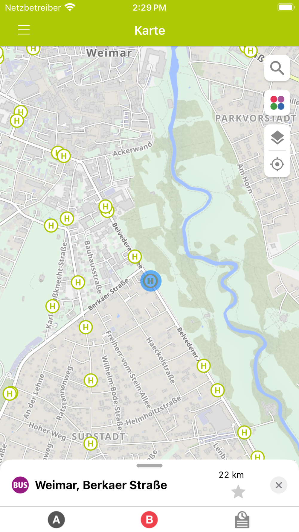 • Haltestellenübersicht mit Ankunfts- und Abfahrtszeiten sowie Umgebungskarte
