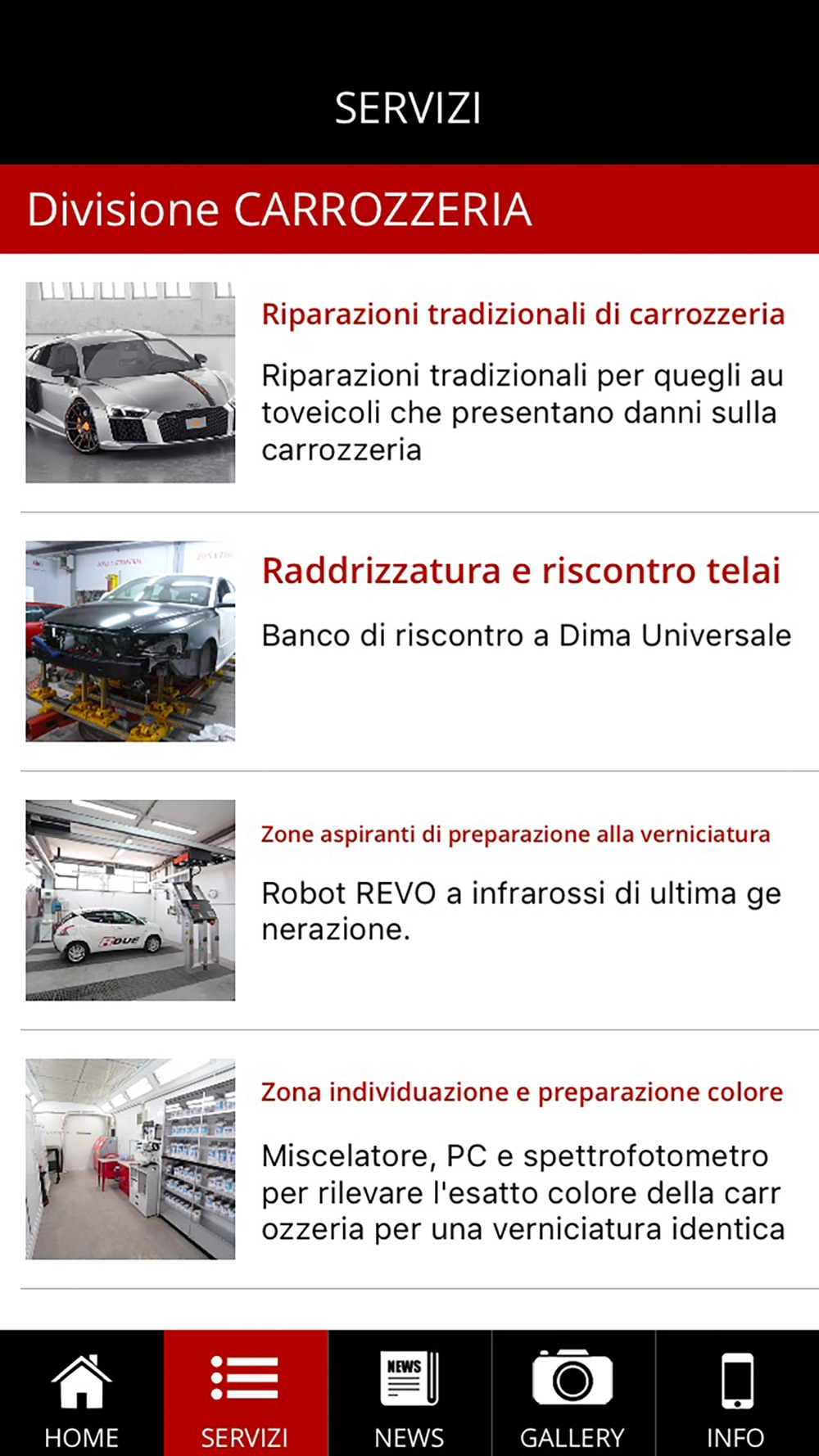 Questa è l’APP ufficiale della CARROZZERIA R DUE. Attraverso quest’APP potrai ricevere, in caso di sinistro, alcuni servizi gratuiti a te dedicati, come ad esempio “Assistenza Clienti”, “Assistenza Legale”, “Soccorso Stradale”, “Auto Sostitutiva” oltre a preventivi, consigli e informazioni di vario genere a seguito di un sinistro o semplicemente per la cura o la personalizzazione della tua auto. Inoltre potrai consultare ed essere sempre aggiornato su tutte le nostre molteplici, svariate, particolari e uniche lavorazioni e servizi che offriamo, informazioni varie, consigli e curiosità, avere sempre sotto controllo tutti i nostri recapiti anche in caso di emergenza. La CARROZZERIA R DUE è composta da diverse Divisioni, proprio per le molteplici lavorazioni esclusive che siamo in grado di svolgere e offrire anche a quella parte di clientela più esigente. Ci raccomandiamo, però, di non pensare che siamo dei fenomeni o, peggio ancora, che