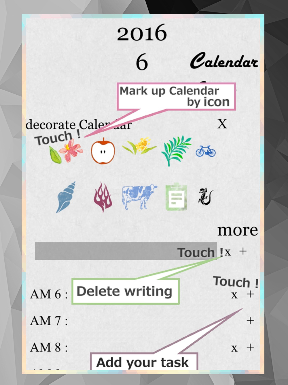 Simple organizer. FREE Scheduler/Calendar application. Cliff is a simple planning application designed for a bit lazy person. Features: Presentation of events in daily schedule. Easy-to-handle agenda Can select Calendar's sticker[icon] without extra pay You will be able to create the events with time and day In addition to-do list function available Over 100 cute stickers [icons] Cliff is a day planner / schedule organizer / TO-DO lists / calendar application for iPhone and iPad.