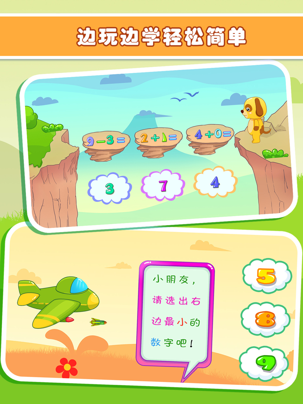 儿童趣味数学大冒险让宝宝在家里即玩游戏又可以学数学。游戏主角里面是一个小狗和小猴子在玩大轮盘,里面有平衡称游戏;猜数字游戏;数学游戏过桥;汽车拉箱子学数字。还有各种趣味的东西,这就要靠宝宝们来完成了。炫酷的画面和精彩的动画可以给宝宝带去欢乐和兴趣。