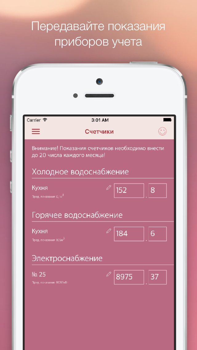 - передавать показания приборов учета, посмотреть динамику личного потребления каждой услуги;