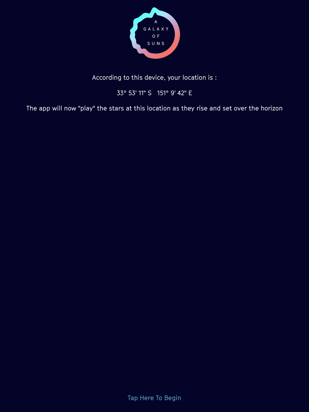 A Galaxy of Suns ‘plays’ the stars as they rise and set over 360 degrees of the horizon – for any location on Earth. Operating on a galactic scale, this project is a collaboration across contemporary art, music, astronomy, design and technology. A Galaxy of Suns works with the native potentials of smart device technology to create a unique experience of the cosmos accessible to wherever you find yourself in the world.
