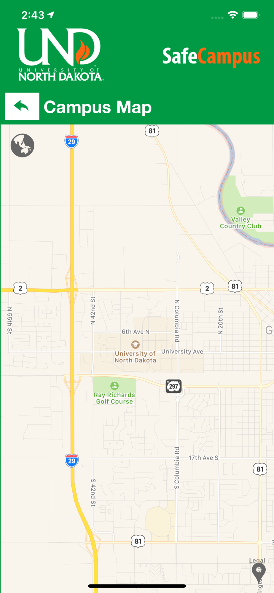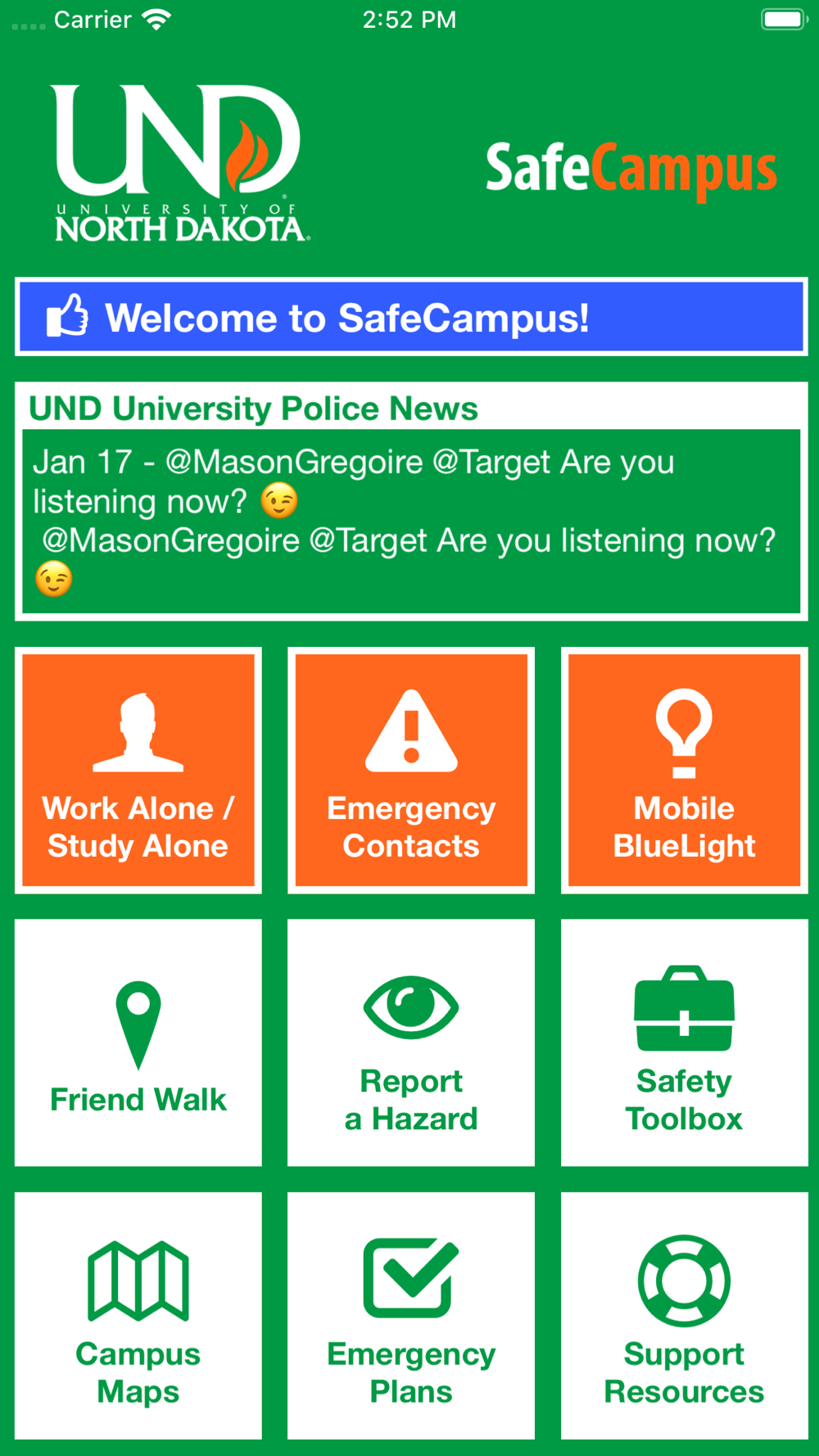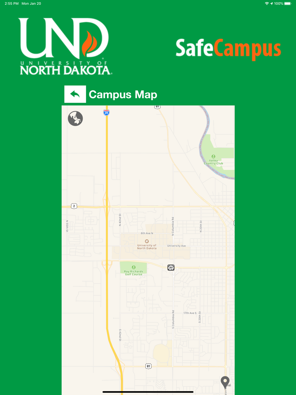 SafeCampus is an essential tool to enhance your safety at University of North Dakota. The app will send you important safety alerts and provide instant access to campus safety resources. SafeCampus is the official mobile safety app of UND.