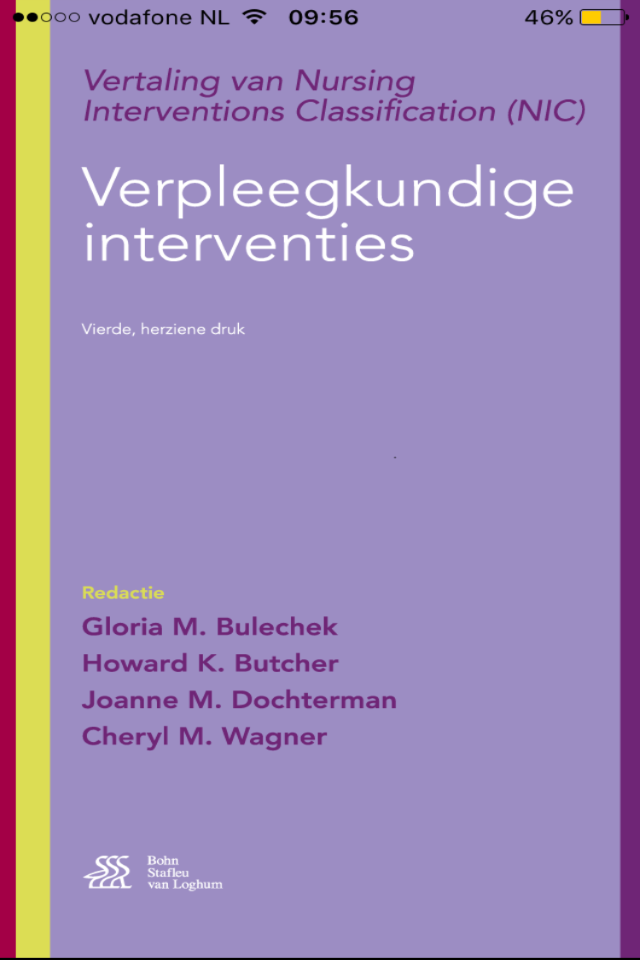 Verpleegkundige interventies is de Nederlandse vertaling van Nursing Interventions Classification (NIC). Deze app is gebaseerd op de vierde, herziene Nederlandse editie die weer een vertaling is van de zesde Amerikaanse druk.