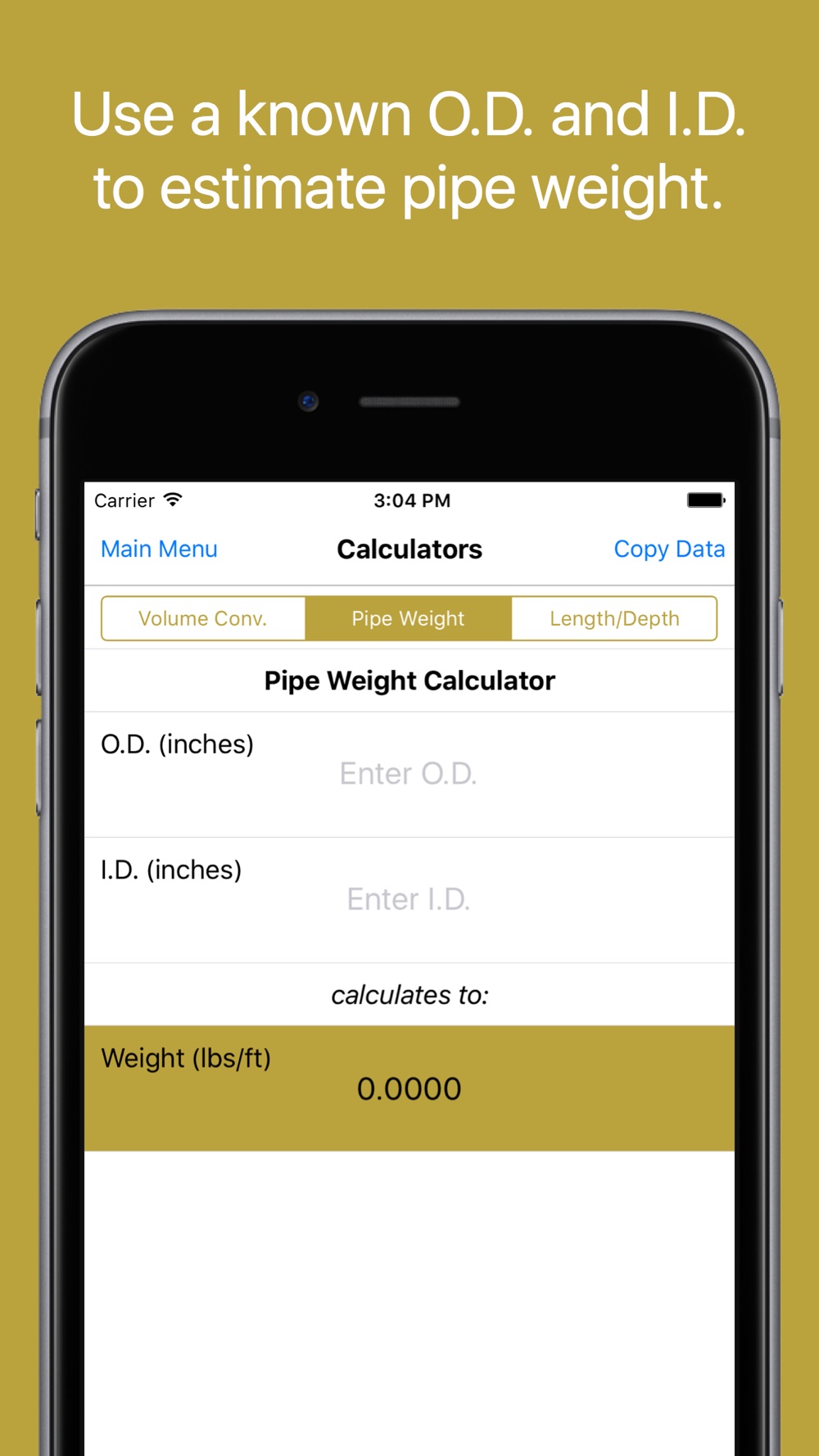 VERY easy and efficient to use, this app performs quick oilfield capacities and pipe calculations. Toggle between decimal or fraction sizes, calculate pipe weight from OD & ID. Get quick tables & conversions in major industry units (Gals, Bbls, CuFt & CuMeters). Even choose to display simple diagrams to show how full the hole or pipe is. Quick reference of TBG ID’s, CSG ID’s & Drift, Pipe Capacities or Displacements.