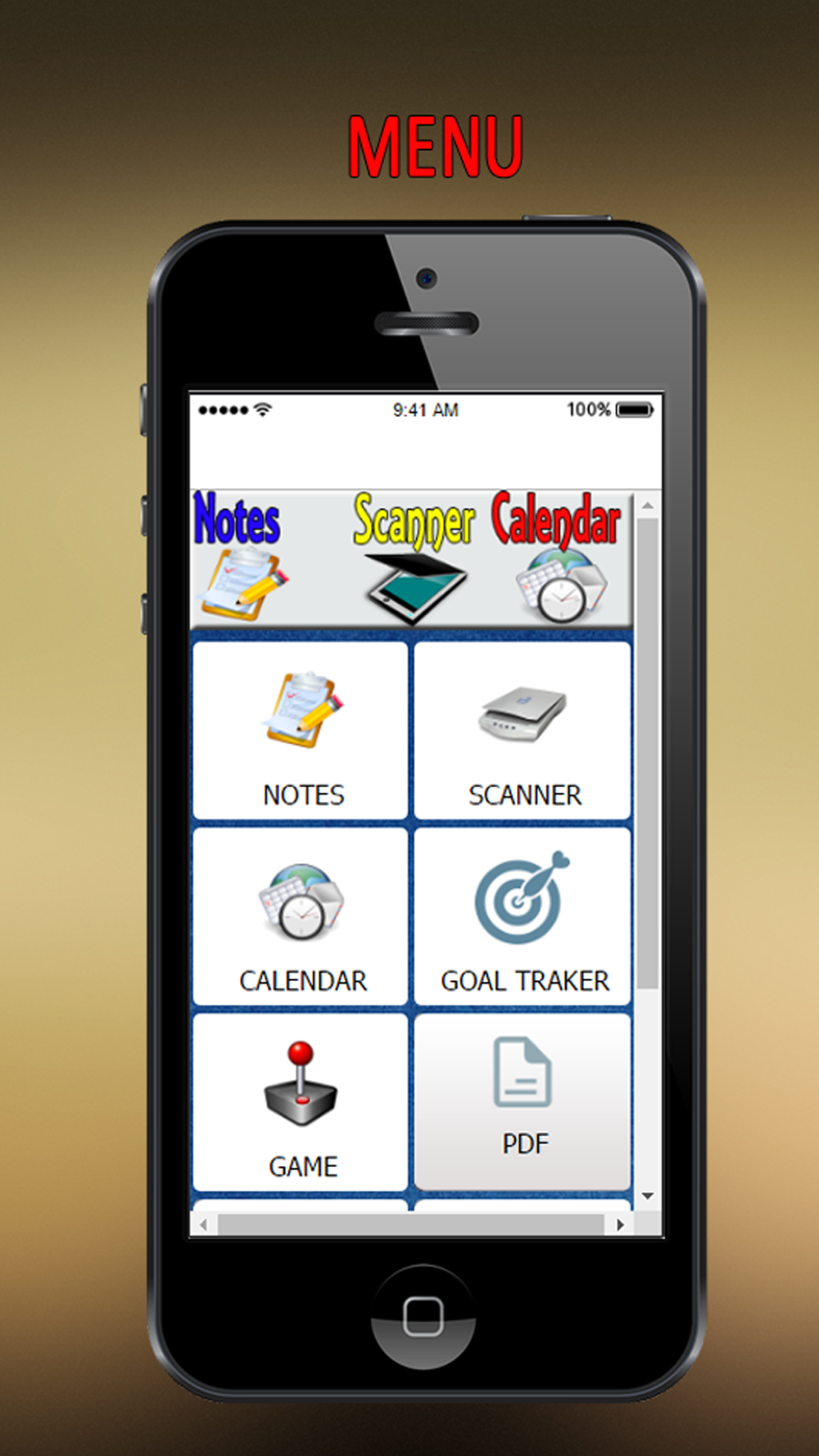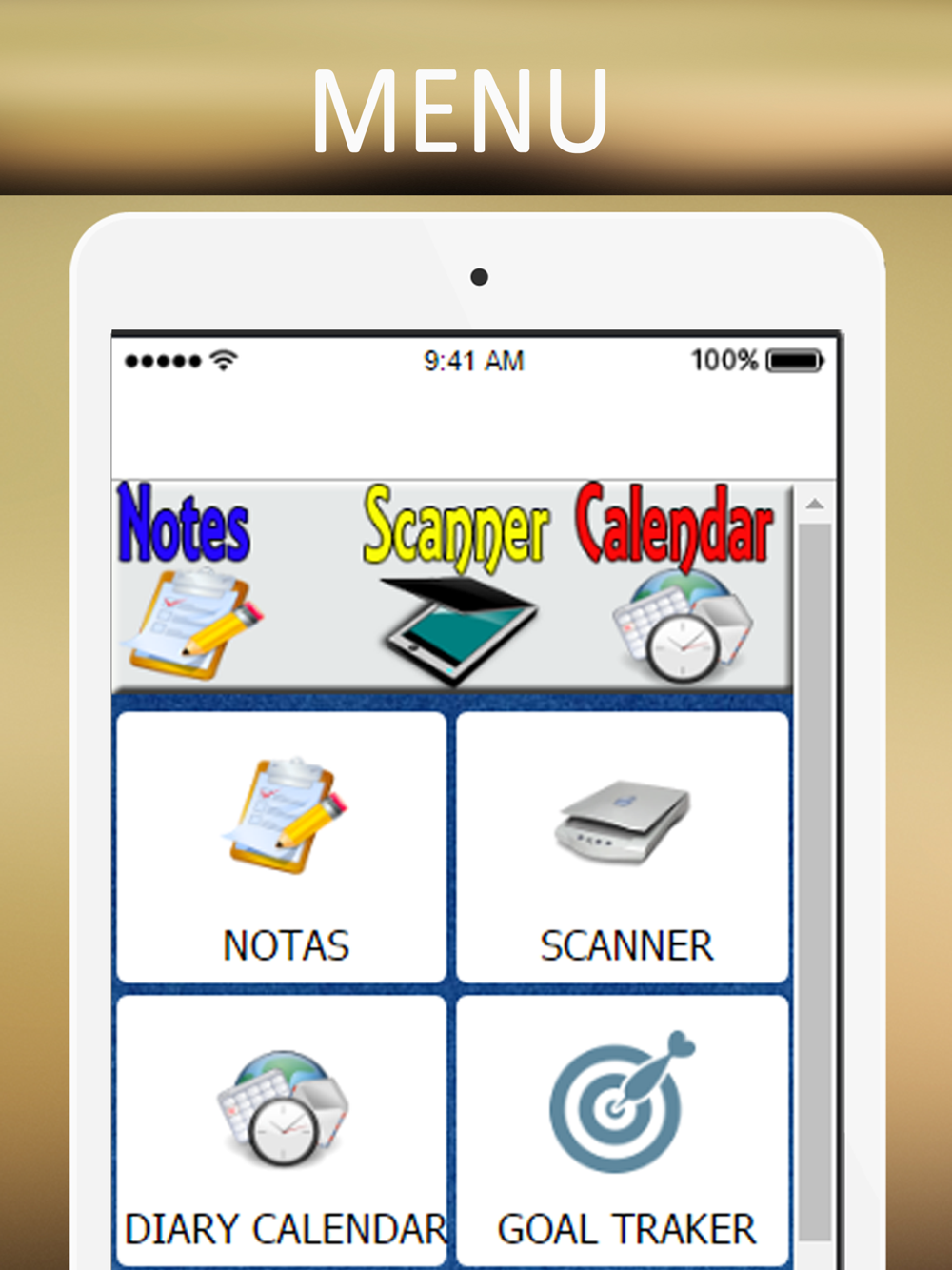 Several functions and tools in one app: Notes, Scanner, Agenda - Calendar, wish list, voice recorder and games.
