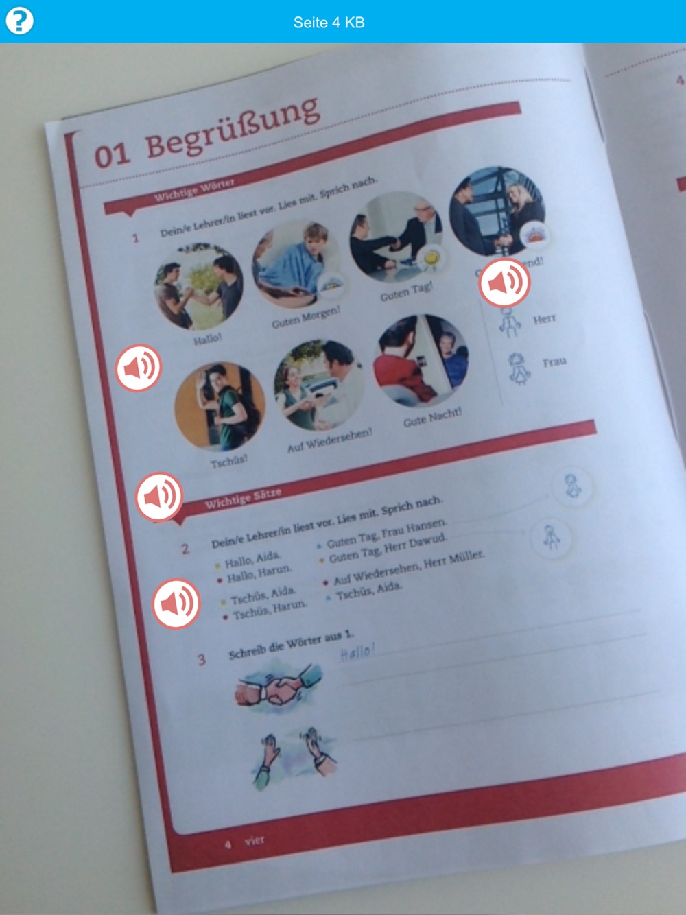 Scannen Sie eine Buchseite aus „Erste Hilfe Deutsch - Ausgabe für Jugendliche“ ein. Die Audio-Symbole werden sofort automatisch sichtbar. Wählen Sie durch Antippen eines Audio-Symbols die entsprechende Datei aus. Die Datei öffnet sich dann direkt in der App. Die Audio-Dateien sind offline verfügbar.