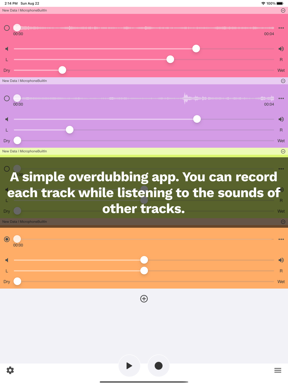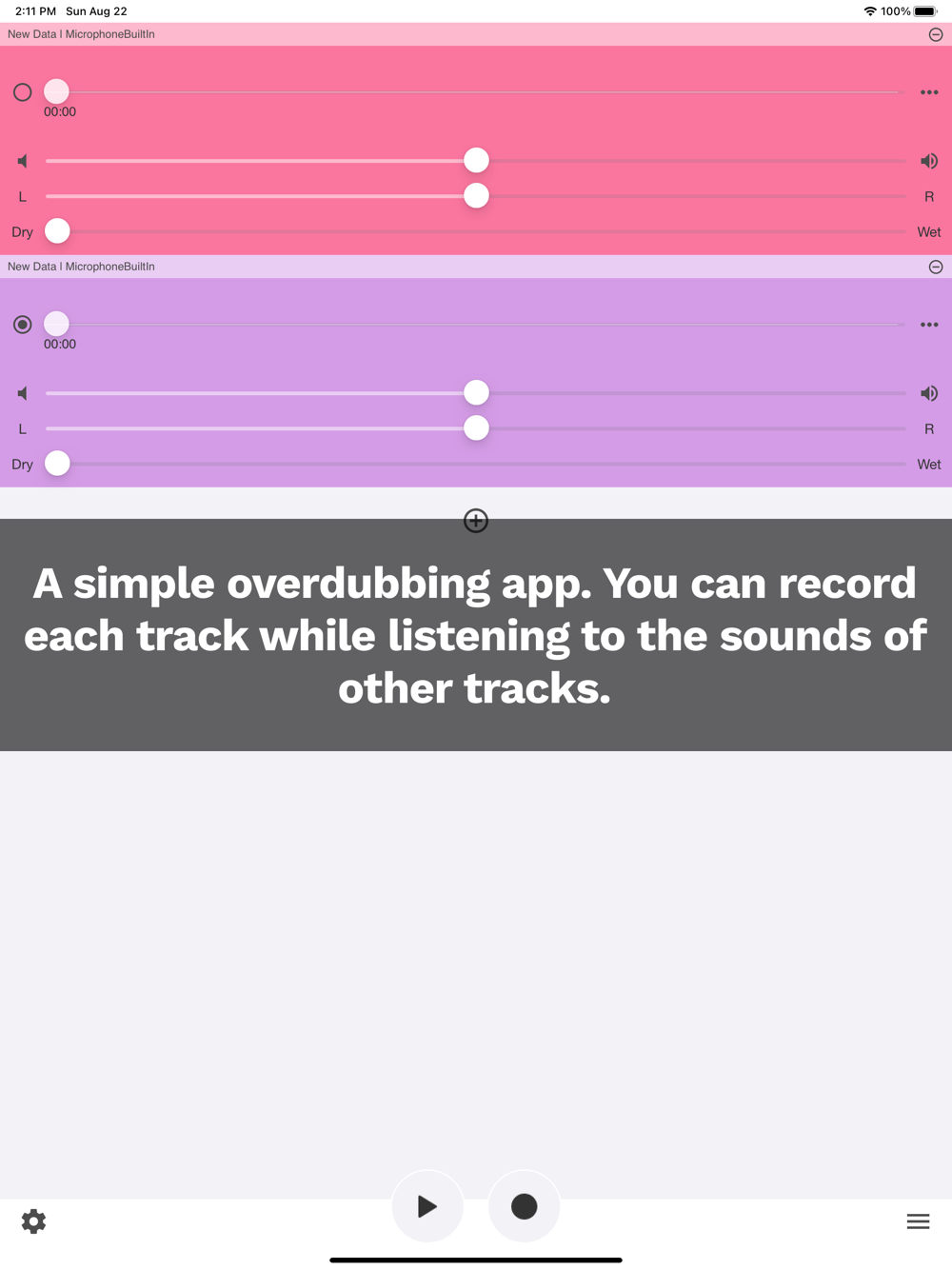 When recording in layers, add a recording/playback track from the plus button. After adding it, turn on the recording target selection on the left to make that track the recording target track. (If you record while playing back, the audio from another track will also be recorded, so use headphones, etc.)