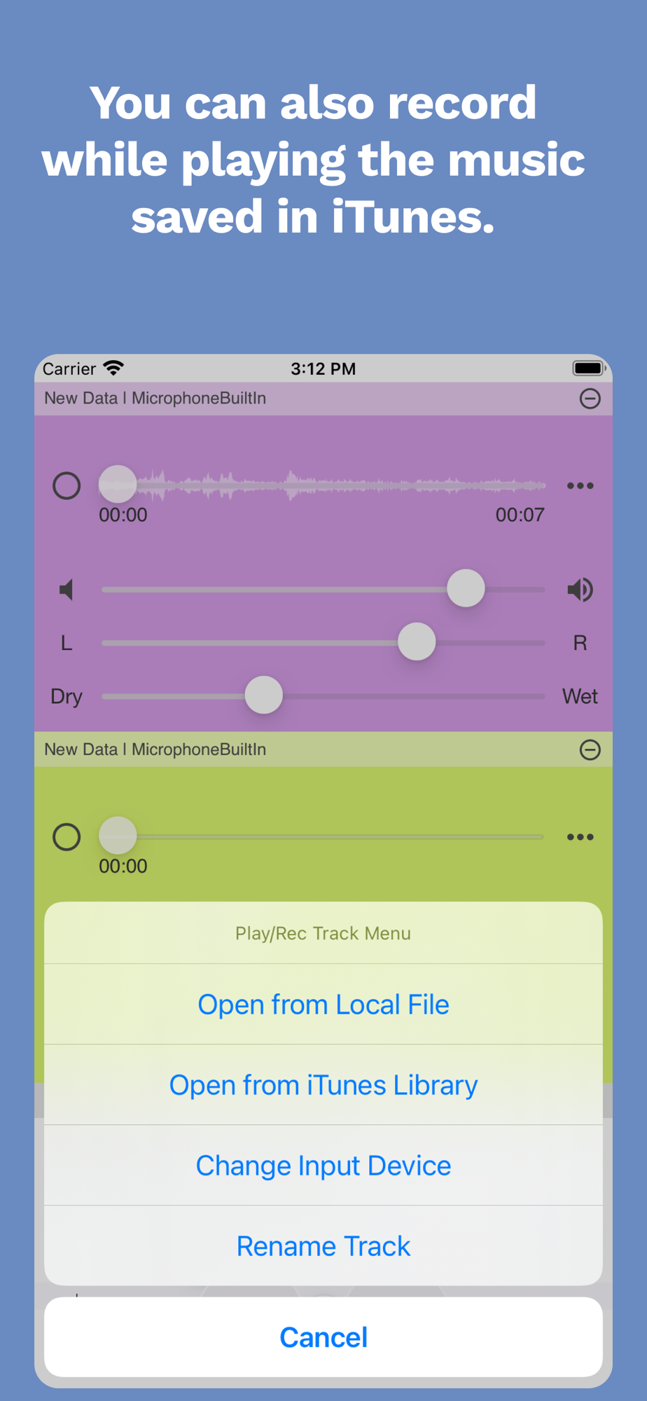 Press the menu button in the lower right of the screen and select Mix to combine multiple recorded tracks into one file. The mixed file is saved as Mix Data in local files. To save/mix audio with applied effects, you need to purchase the effect application option.
