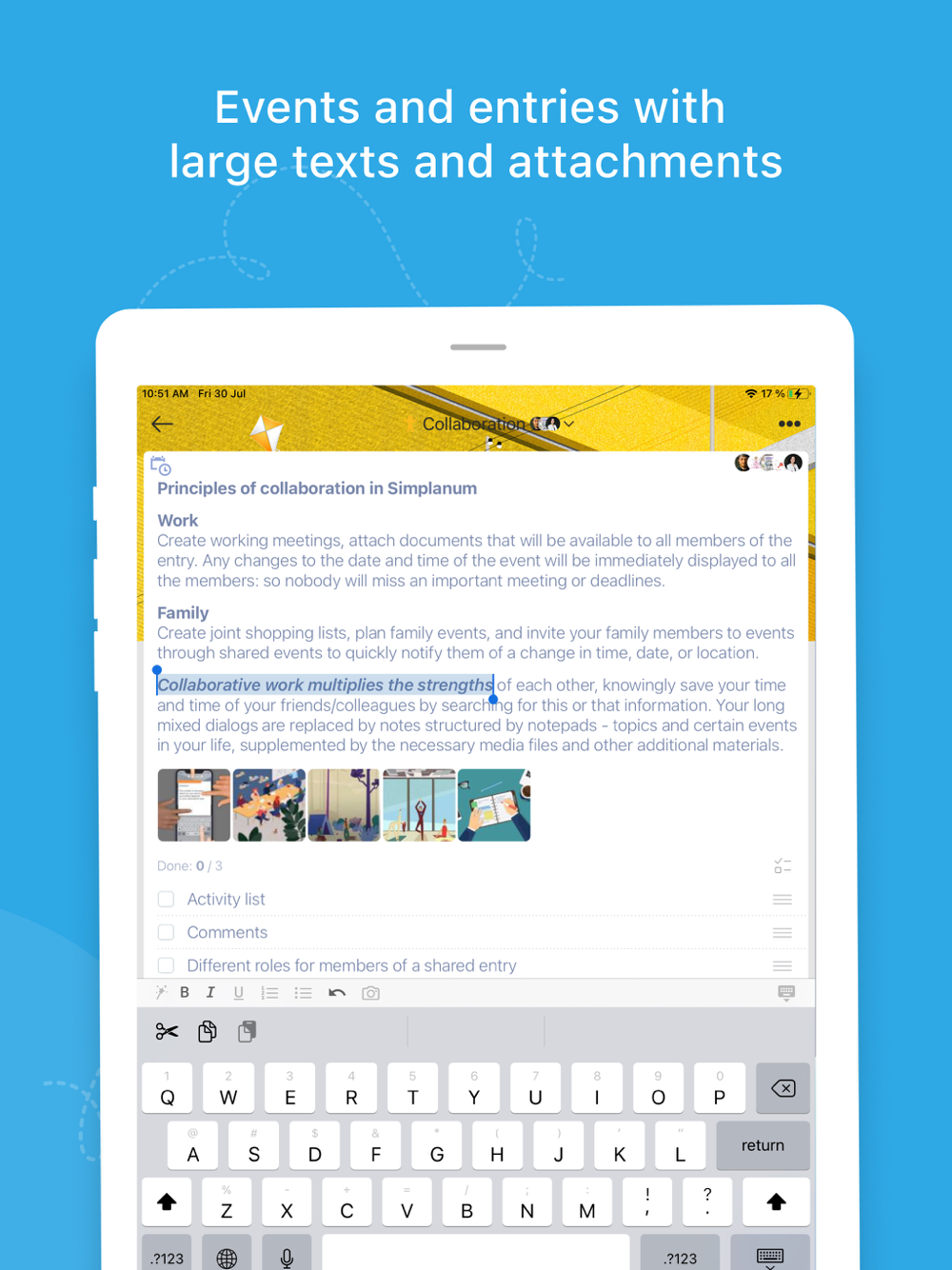Simplanum allows You to create notes with large text and checklists, add the date and time to the entry, convert it to the event, attach an unlimited number of files of different types, and share records with your contacts.