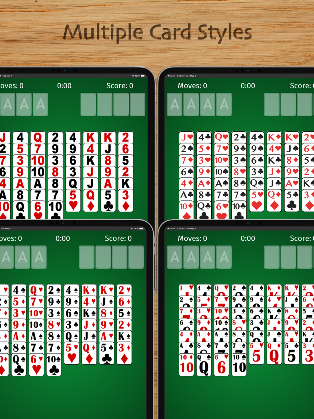 This is a classic FreeCell Solitaire card game featuring big cards that are easy on your eyes! Relax and play a FreeCell Solitaire game with 1 finger using drag-and-drop or single tap gameplay. You have unlimited hints and undo's if you get stuck. All for FREE!