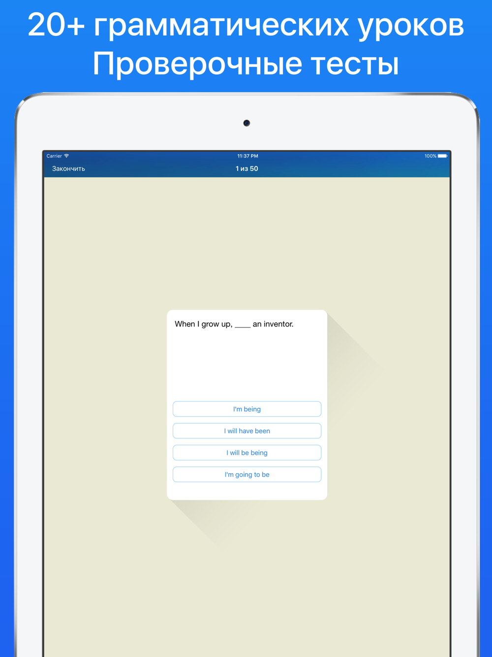 Также в программе Вы найдете грамматические уроки и тесты после каждого урока для проверки.