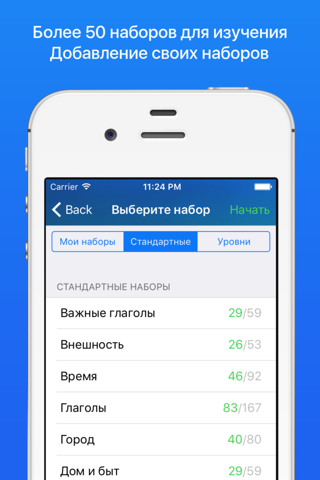 В программу входят более 50 стандартных наборов для изучения и наборов для скачивания! В словаре мы собрали свыше 11000 самых употребляемых слов и выражений и разделили их по группам и уровням. Все слова озвучены! Вы сможете создавать собственные наборы слов или импортировать наборы слов с компьютера с помощью Excel.