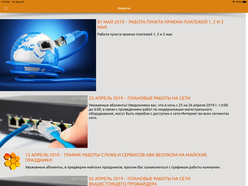 Мобильное приложение АВК-ВЕЛЛКОМ REVO обеспечивает доступ к личному кабинету для наших абонентов, а также возможность отправки PUSH уведомлений о работах, производящихся нашими специалистами, а также о пополнении баланса. Также для пользователей обеспечена возможность просмотра последних новостей нашей компании, а также просмотр камер проекта Безопасный Город и новостей наших аккаунтов в социальных сетях, таких как Facebook, Twitter и Youtube. Желающие пользоваться услугами интернет-провайдера АВК-ВЕЛЛКОМ могут отправить заявку на подключение с помощью данного приложения.
