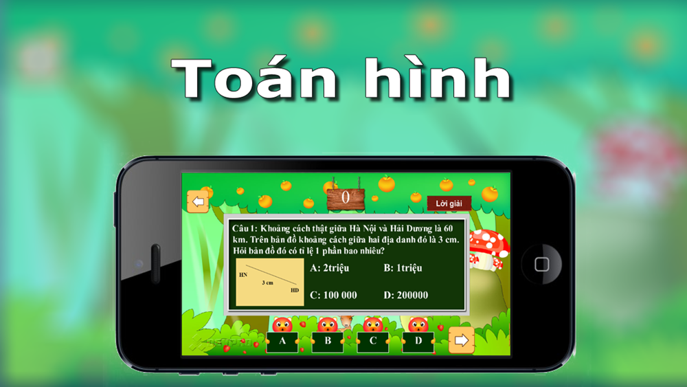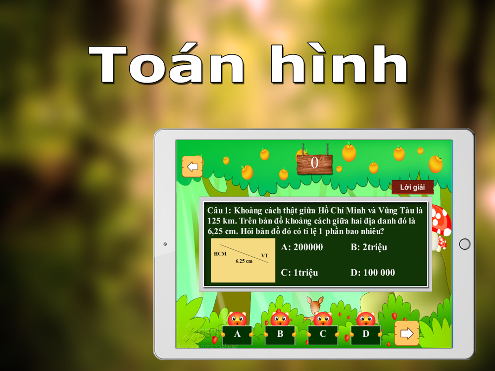 - Là sự kết hợp hoàn hảo giữa hình ảnh và toán học. Mỗi bài toán sẽ 1 đề bài liên quan đến hình ảnh đi kèm. Các bé sẽ phải tập trung đọc đề bài và quan sát hình ảnh để tìm ra lời giải và chọn đáp án chính xác nhất. Các bài toán về hình học gồm những dạng toán sau: Tính diện tích, thể tích, chu vi, tính tỉ lệ bản đồ và các bài toán tính diện tích nâng cao, giúp các bé phát triển khả năng tư và tính toán một cách tốt nhất.
