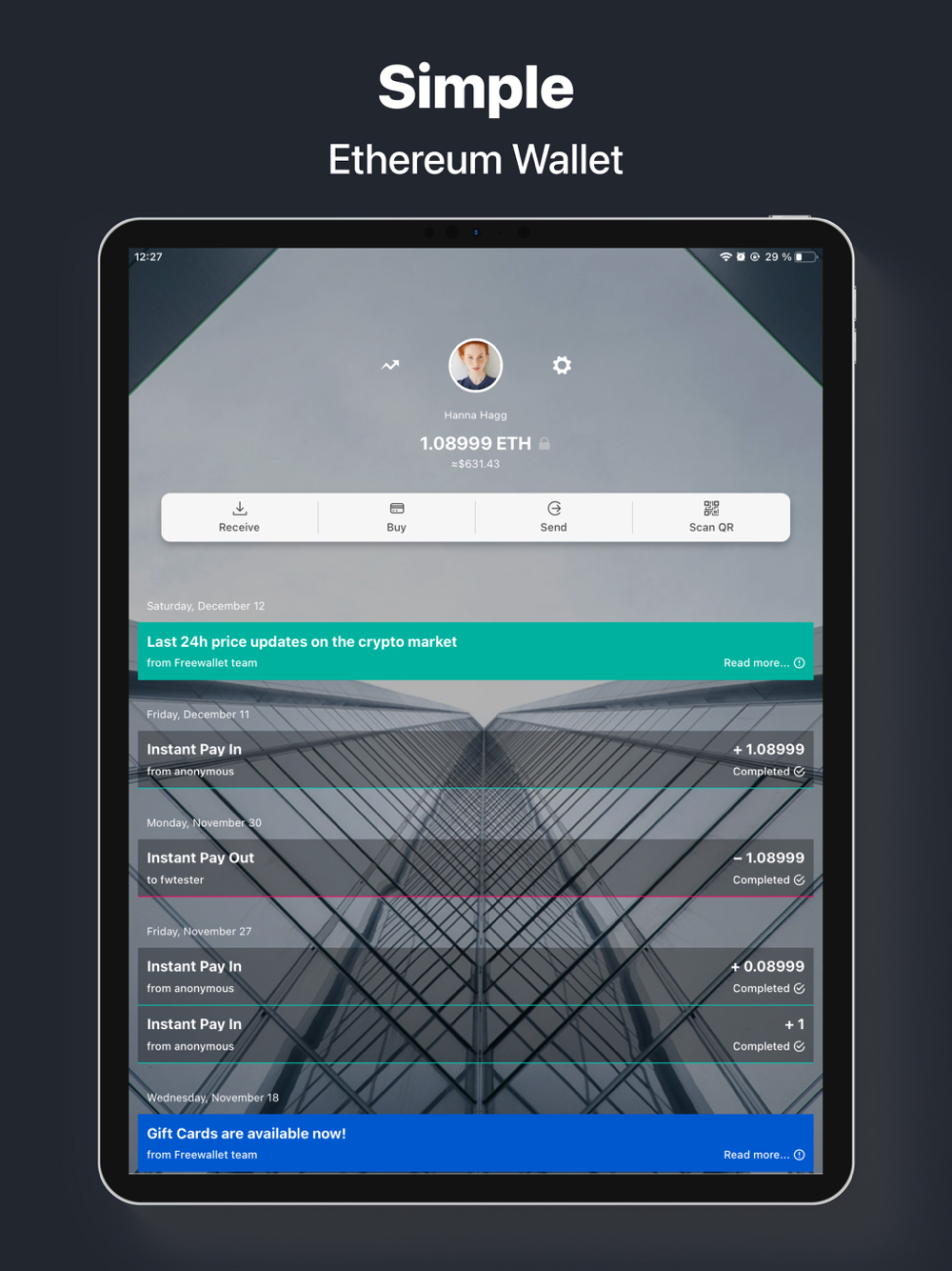 Install Freewallet’s Ethereum Wallet to manage and store your Ethereum in a secure cryptocurrency app. The ETH wallet combines all the best characteristics of blockchain wallets – it is safe and easy to use wallet with multi-level security. Ethereum Wallet will suit everyone from crypto beginners to ETH masters.