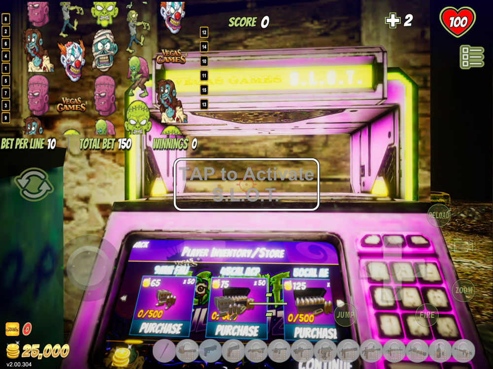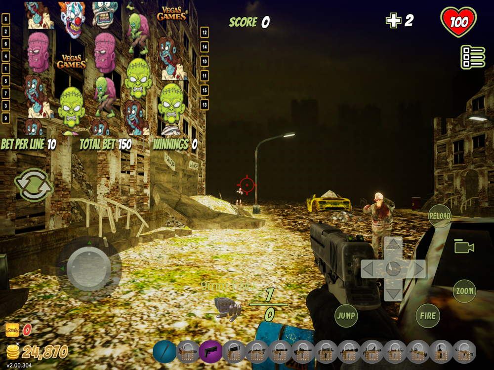 Take slots to the next level with the first ever Skill Slotz game: Zombie Skill Slotz! Use your FPS skills to blast zombies and earn spins on your trusty S.L.O.T. (Survival League Ordnance Transponder) to keep the action going and win big! “The apocalypse has never been more fun! The year is 20XX and the zombie hordes have turned everyone into mindless rotter. Well, mostly everyone! Now enterprising organizations have rounded up the remaining living dead and placed them in quarantine zones that they own and control. In return, they have been granted a unique gaming license to turn these cannibal corpses into the next big entertainment event. The premise is simple: Throw some lucky contestant (or prisoner/snooping reporter/YOU) into a quarantine zone and see how long the challenger can survive on his or her pluck and courage. Use your trusty S.L.O.T. machine to rack up prizes that will help you stay alive and win the jackpot! And now here you are poised to enter the arena! Good luck on your next round! We’ll see you again, hopefully in the same state of decomposition…”