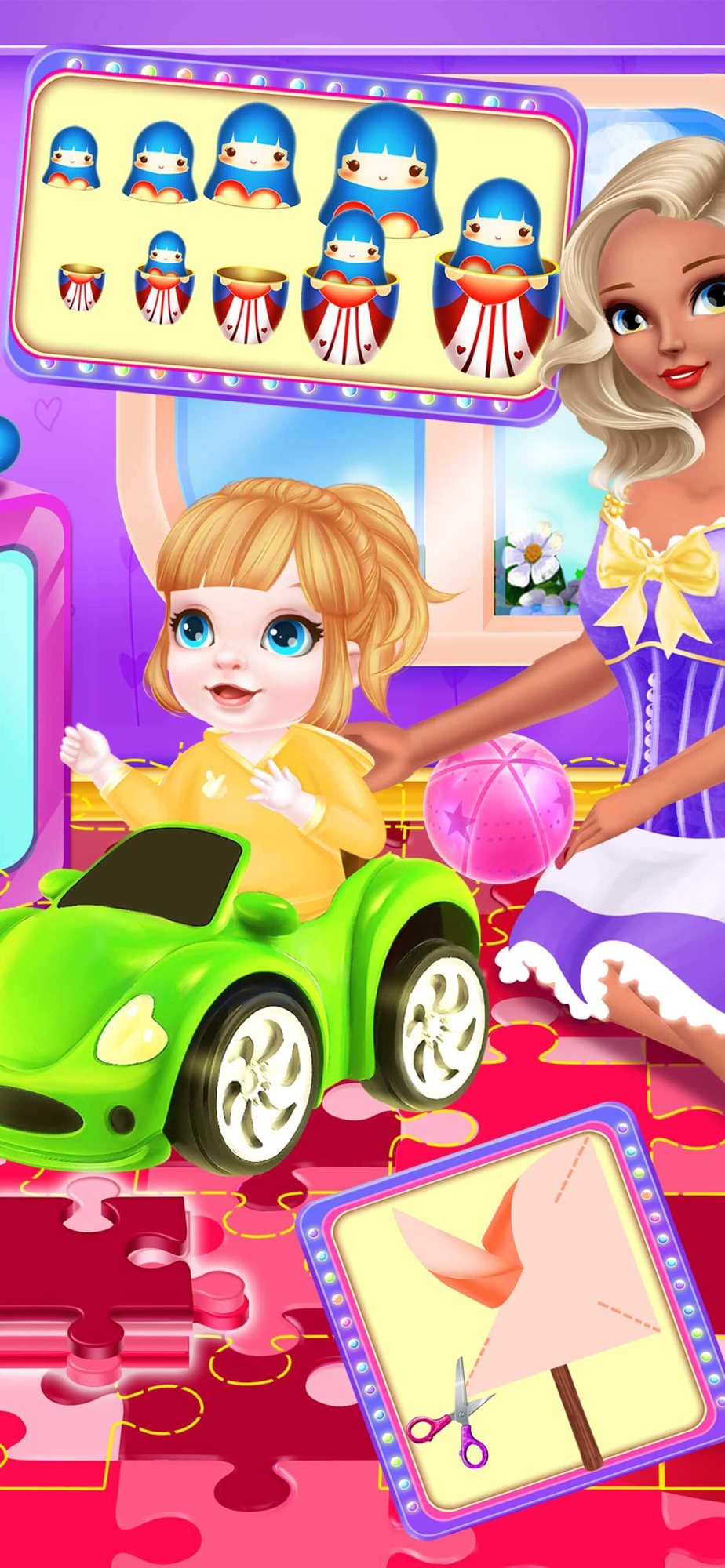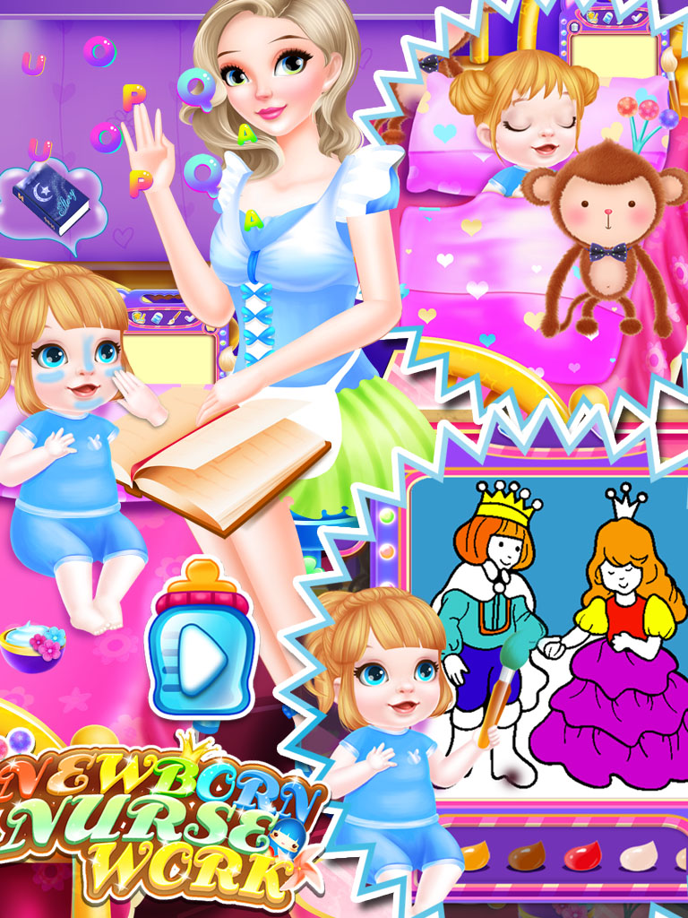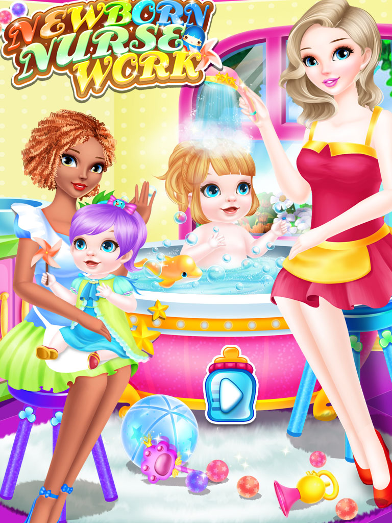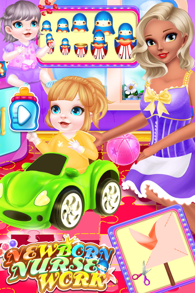 Come to join our brand new baby nurse game. Firstly, choose one nurse that you like and then try your best to dress up her beautifully. Choose the hairstyle,dresses and shoes for her and make her as beautiful as you can. Then you can come to let the nurse take care of the baby bathing. Inject the bathtub with warm water and make some bubbles for the baby to let her be happy. Then come to use shampoo to wash her hair. After that you can come to choose one type of bath foam to wash the body of the baby and use shower head to clean away the bubbles. At last of the bathing, come to give the baby some toys to play and use the towel to dry her body. Put some clothes for her to make her happy. The third stage of the game, you need to decorate the baby’s play room with our given decoration materials. Use the jigsaw to make the playing areas floor and then decorate the room with some given furniture. Then you can make one windmill for the baby and make the tumbler from small one to the big for the baby to play. The fourth stage of the game, you need to look after the baby for night sleeping. Put on some night clothes for the baby and play with her by using the drawing board for a nice picture. Give the baby toys for her to play and read one good story to help her to have a sleep. Turn off the lamp when the baby got sleep. The last stage, come to dress up the game with cute baby clothes and shoes.