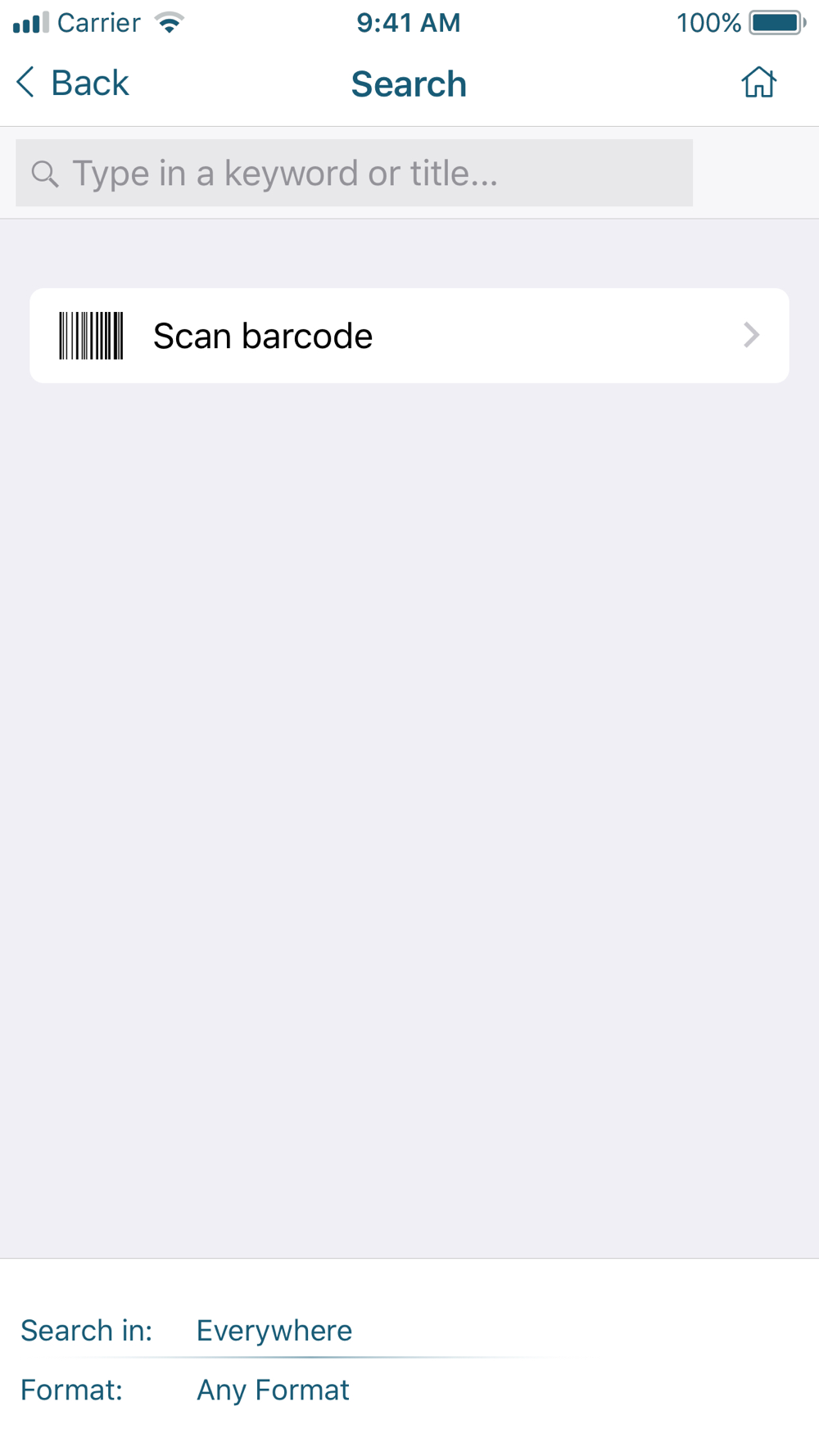• Search by barcode: Use your device’s camera to scan the barcode on a book, CD, DVD, or