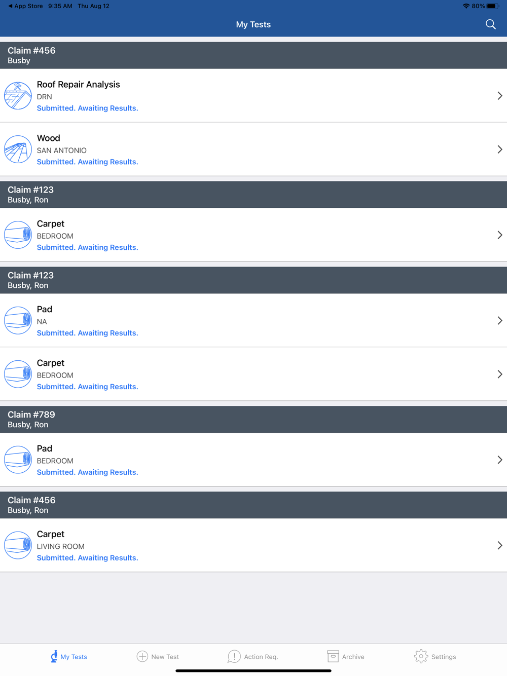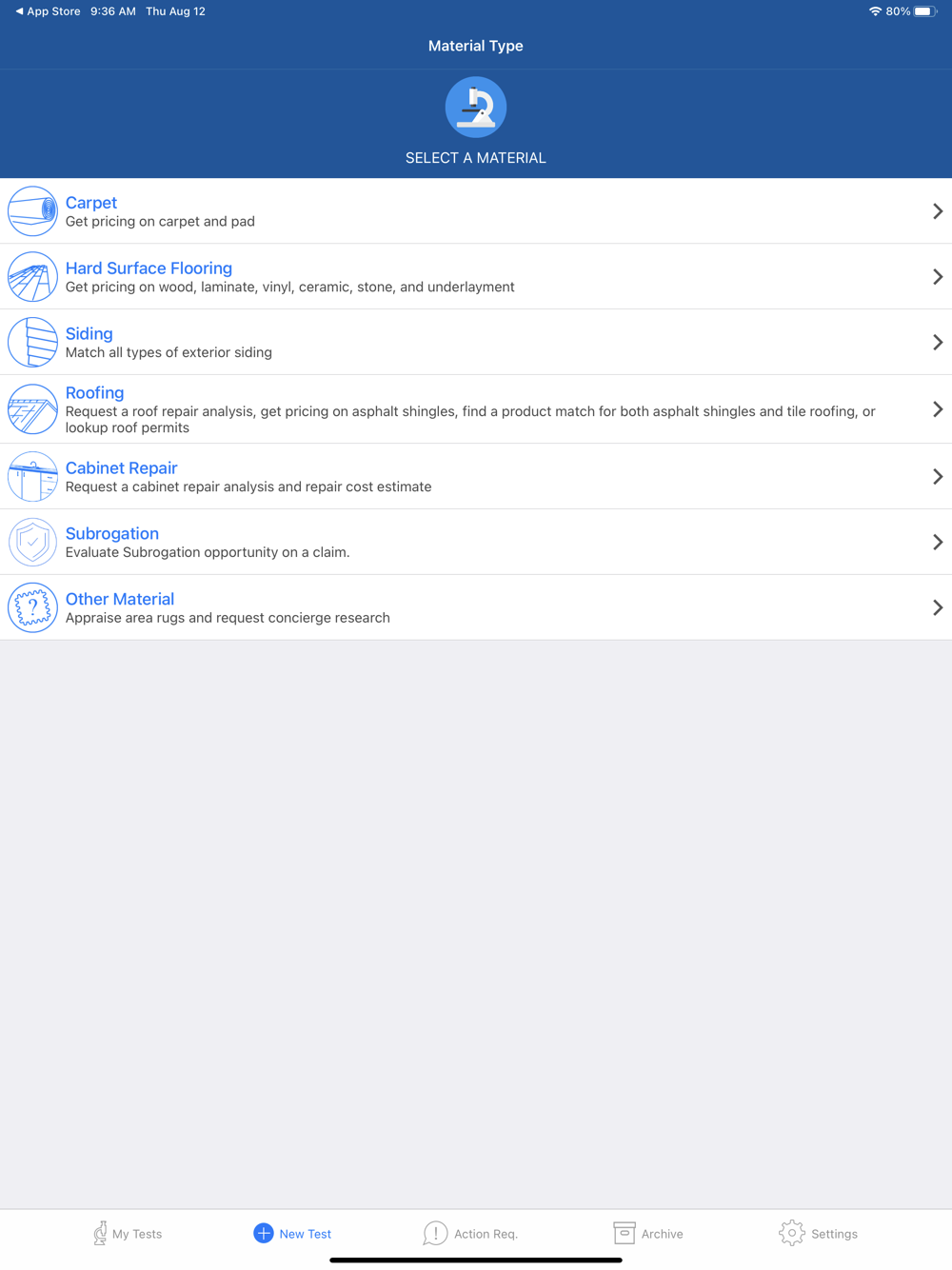 •	Test carpet, wood, laminate, vinyl flooring, siding, and roofing in the app and skip sending the sample