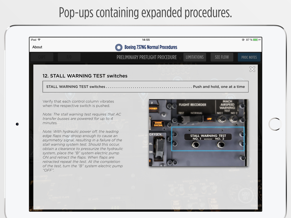 The Boeing 737NG Normal Procedures Trainer app visualizes flows of normal cockpit procedures to help you learn and remember the order of actions and locate cockpit controls. The actions are located by hotspots that trigger pop-up messages with expanded procedures.