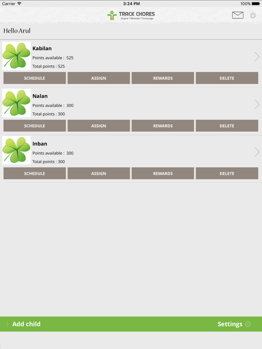 Our child dashboard attracts kids with its user friendly look and feel. Child can view their chores and the rewards that are available on completing the chores.