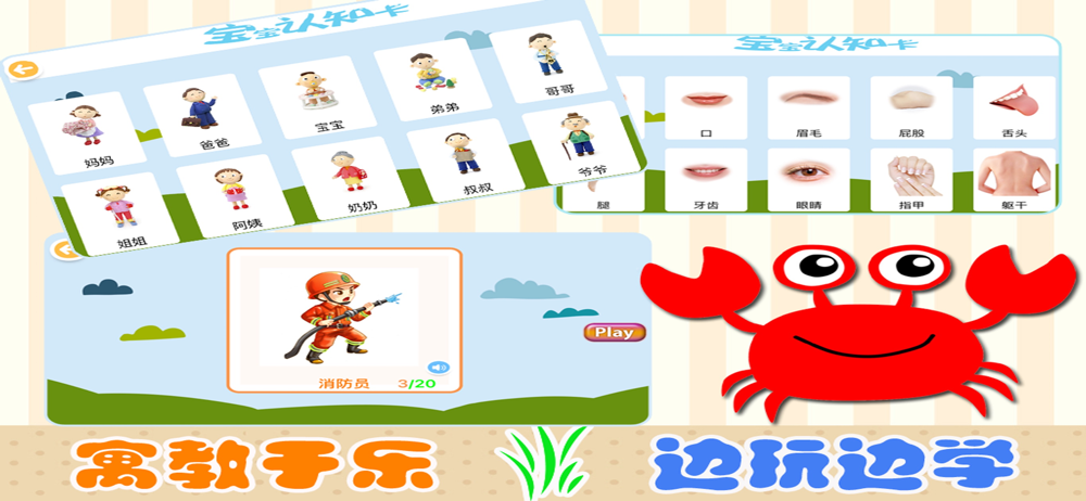家庭育儿益智启蒙教育必备的免费儿童游戏,互动学习,通过实物图片,让宝宝更早学会识别生活中的事物。学身体部位-启蒙认知,家庭成员认知,职业认知。