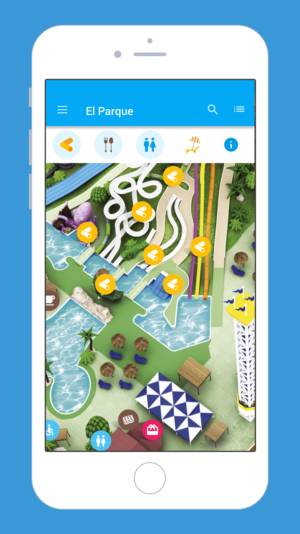 - Consultar toda la información que necesitas sobre el parque: localización, horarios, atracciones, restaurantes, puestos de venta, hamacas, etc.
