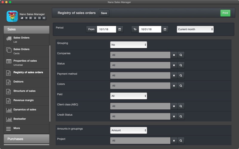 By means of Nano Sales Manager you may arrange the customized sales as well. Issue the invoices for the products not available in stock and estimate the products requirement in the "Purchases" module. Upon receipt of the products from the suppliers you forward them according to already made sales orders to your clients.