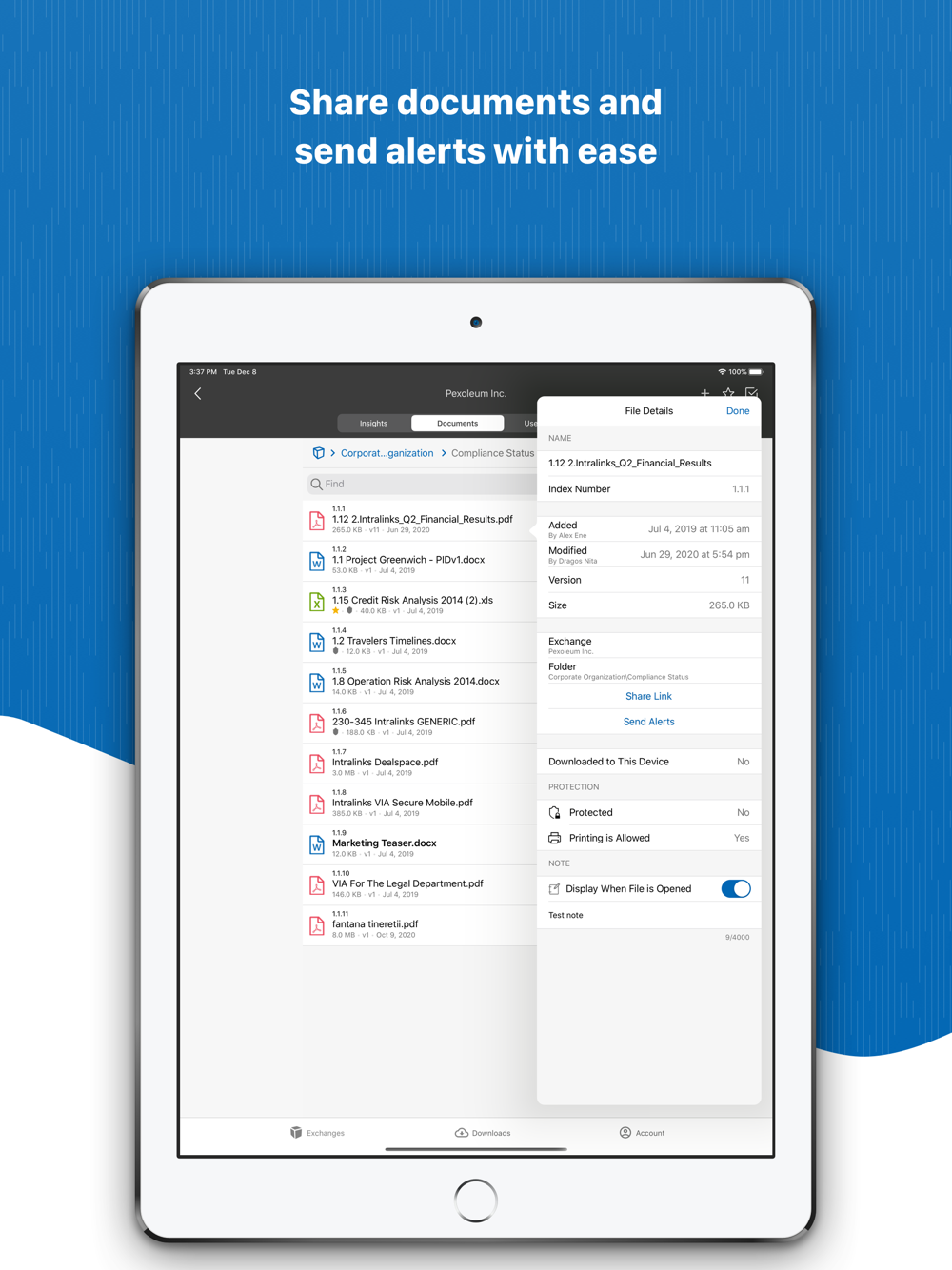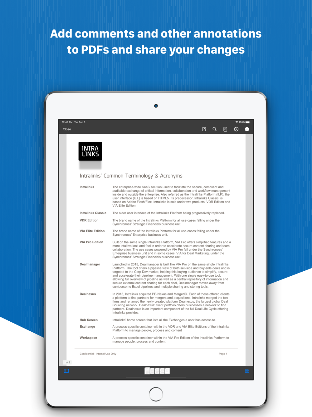 Intralinks for iOS enables business professionals to securely share sensitive data with trusted partners, vendors and third parties in Intralinks exchanges, while maintaining control. In addition to greater flexibility, Intralinks incorporates industry-leading security at the device, system and enterprise levels.