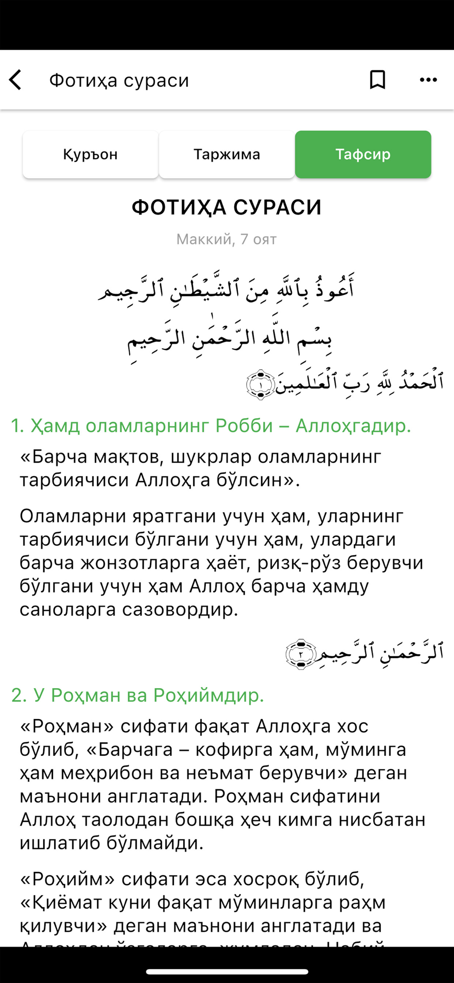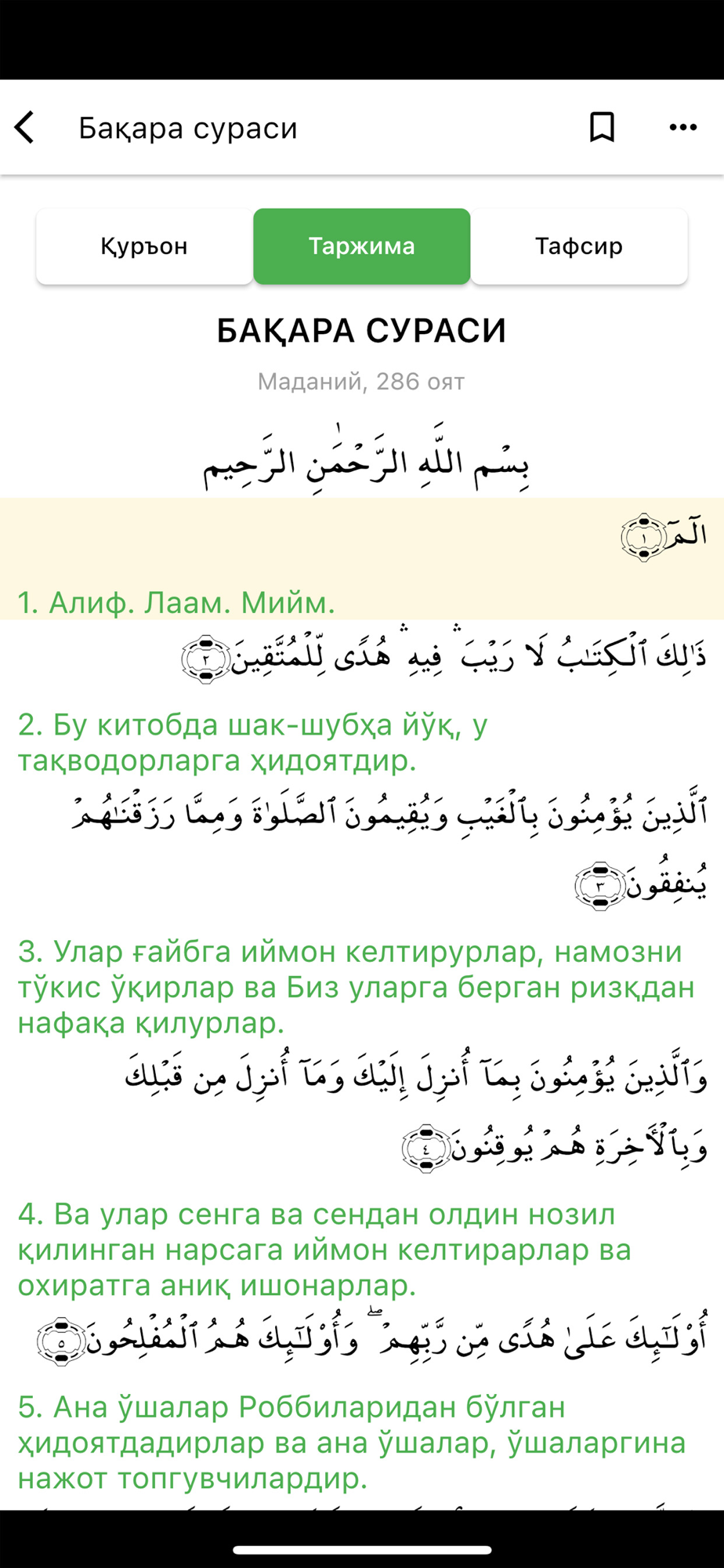 Ушбу дастур орқали сиз Қуръони Карим оятлари, уларнинг ўзбек тилидаги маъно таржимаси ҳамда тафсири билан танишишингиз мумкин.