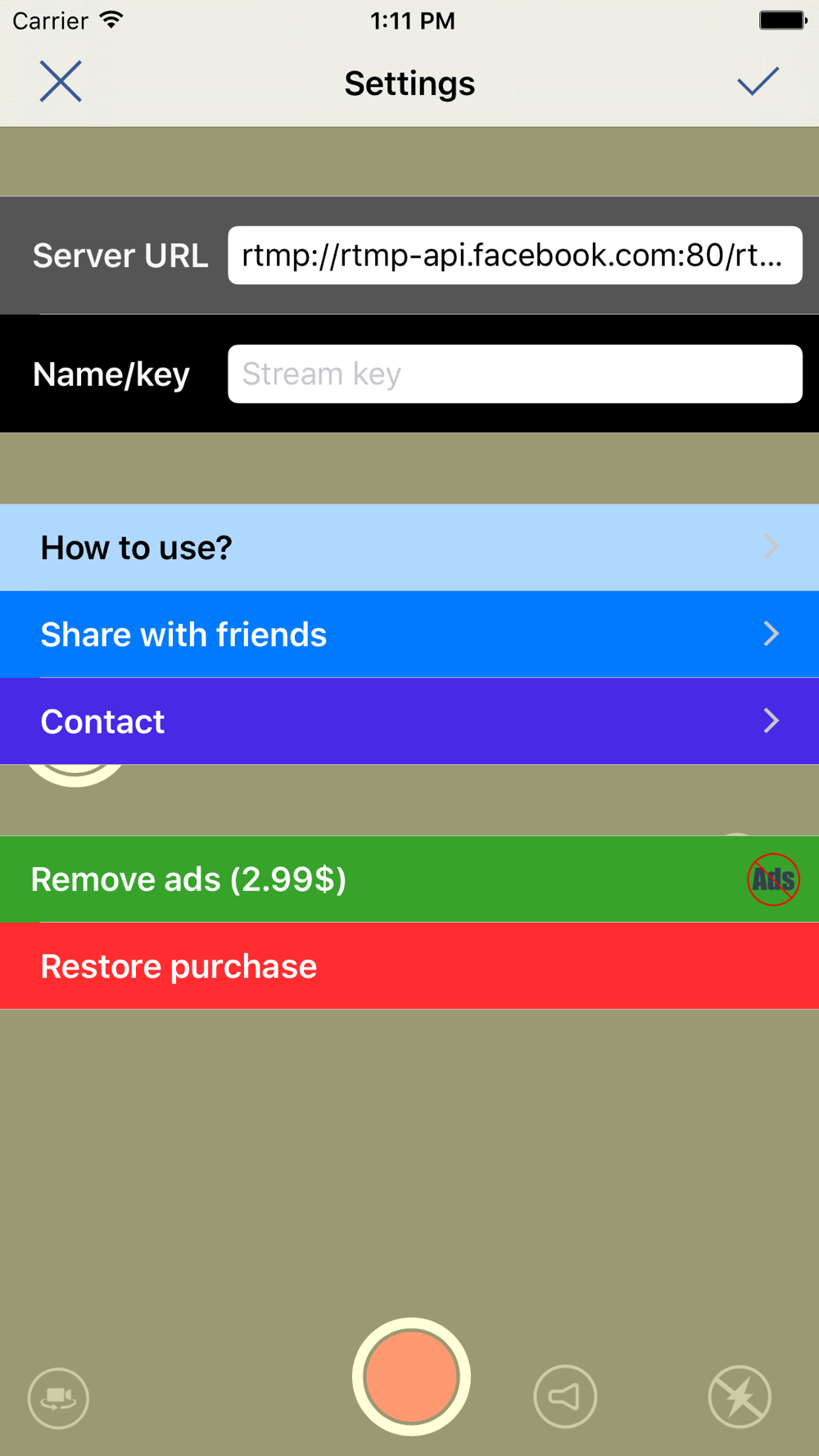 When you open the app, all you need to do is enter the server URL and a key from either Youtube or Facebook and press the record video button within the app to start your live stream. Full instructions are written inside the app.