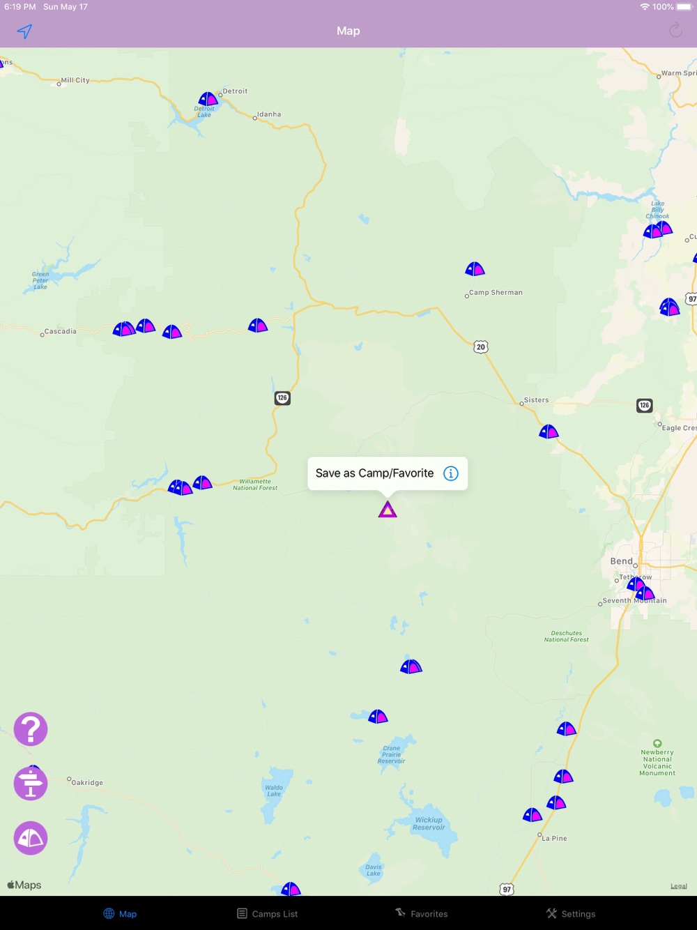 Camping spots & RV's is a simple and easy to use map to find the nearest Campsites or RV Park locations.