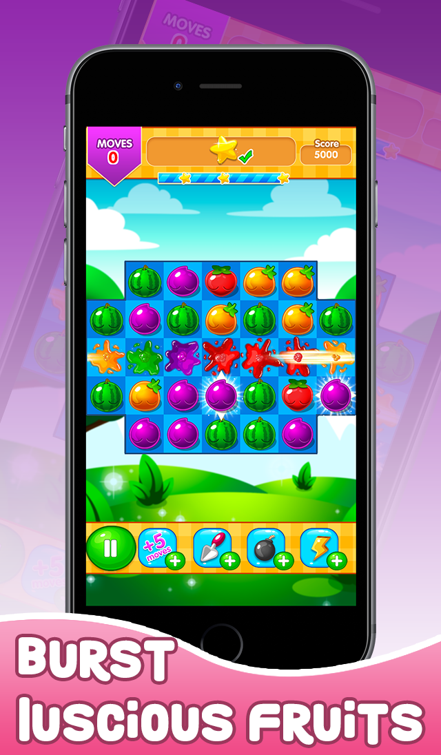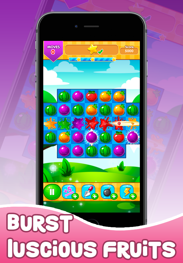 Juice King: Match 3 Puzzle is a completely free to play match 3 type puzzle game, with hundreds of fruity levels and sweet stages that span the colorful world of Juice King: Match 3 Puzzle and the kingdom of fruits. The fruity kingdom of Juice King: Match 3 Puzzle is home to the sweetest fruits in the world. Tender Strawberries, sugary Watermelons, juicy Oranges, ripe Blueberries and yummy Prunes are all in danger from the Evil Berry who has been haunting them since they were seedlings. Lead the fruits in the war against the Evil Berry and help them go sword to sword in Juice King: Match 3 Puzzle. Plan and select the right moves to beat the levels with the best possible score and minimum number of moves to stay one step ahead, all the way.