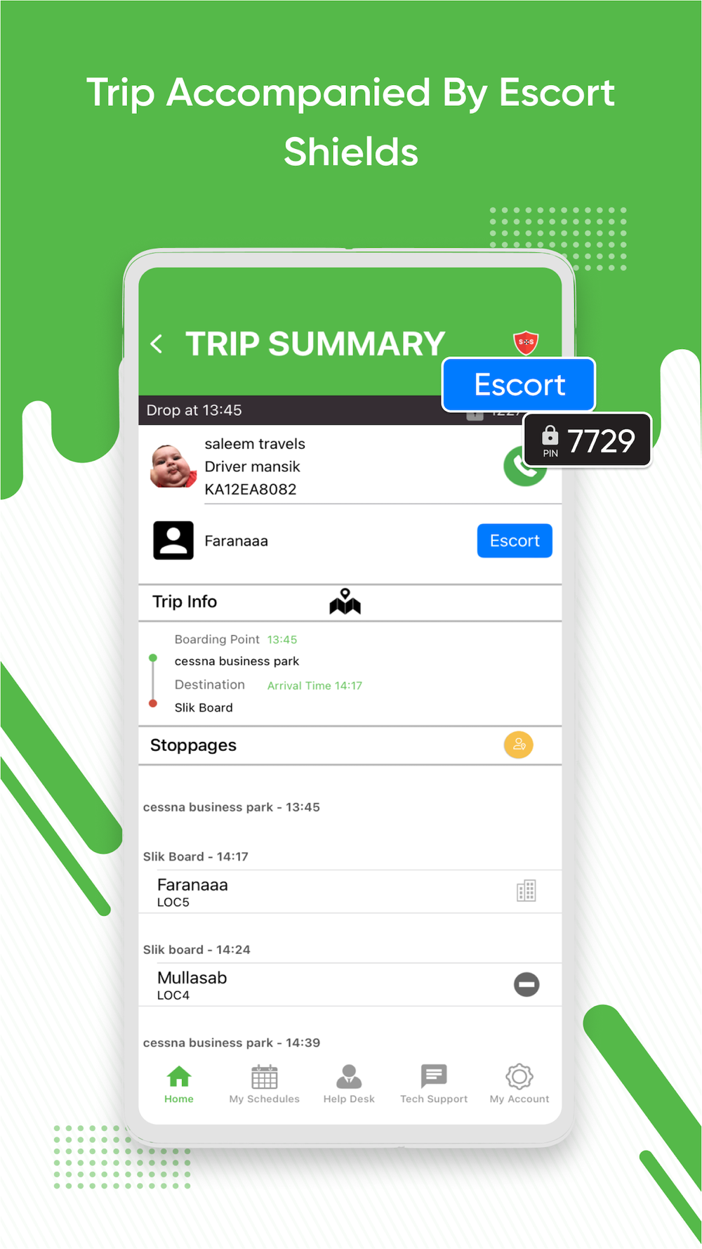 • Trip Details: Employees can easily view trip details including driver profile, vehicle number, pick & drop points and others.