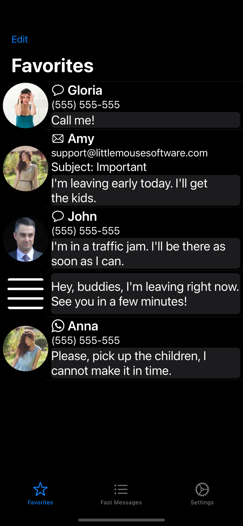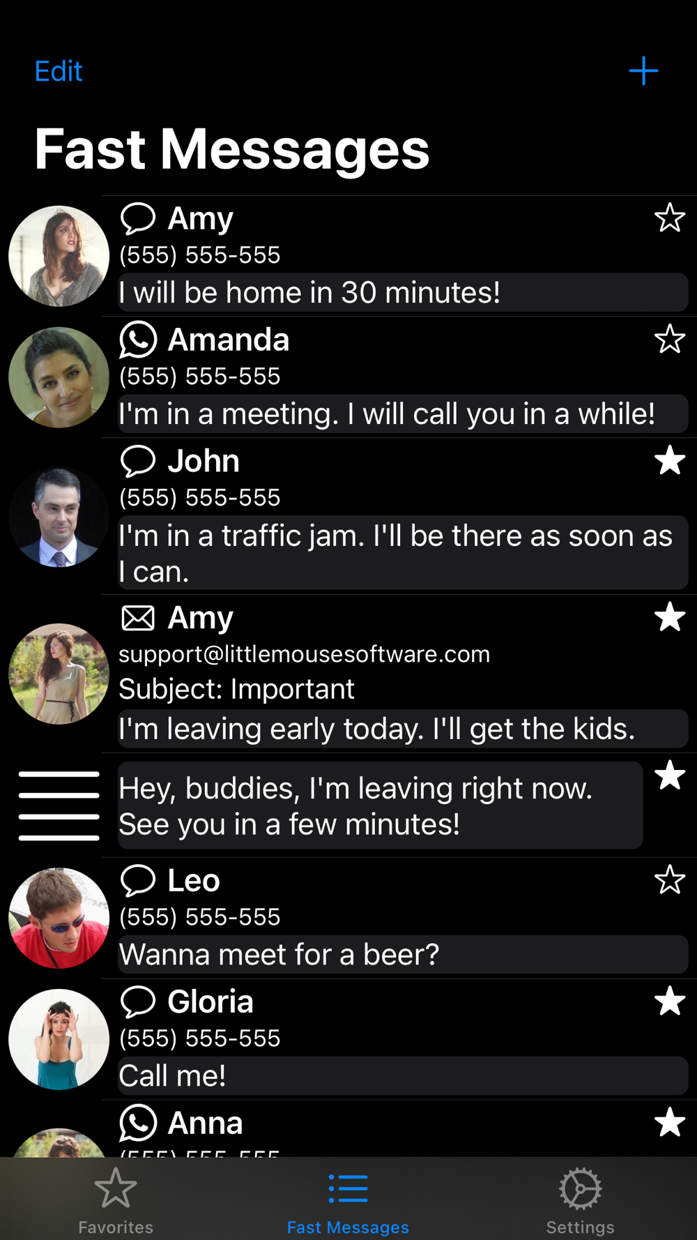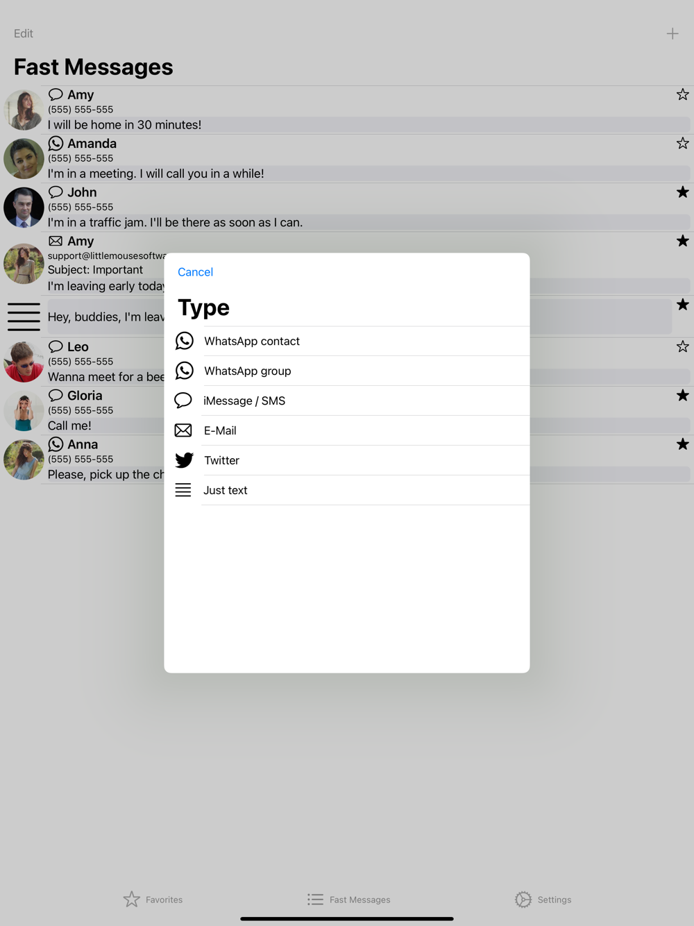Separate favourite tab, with the option of displaying your favourite fast messages with bigger text, so that you can easily tap on them on the go.
