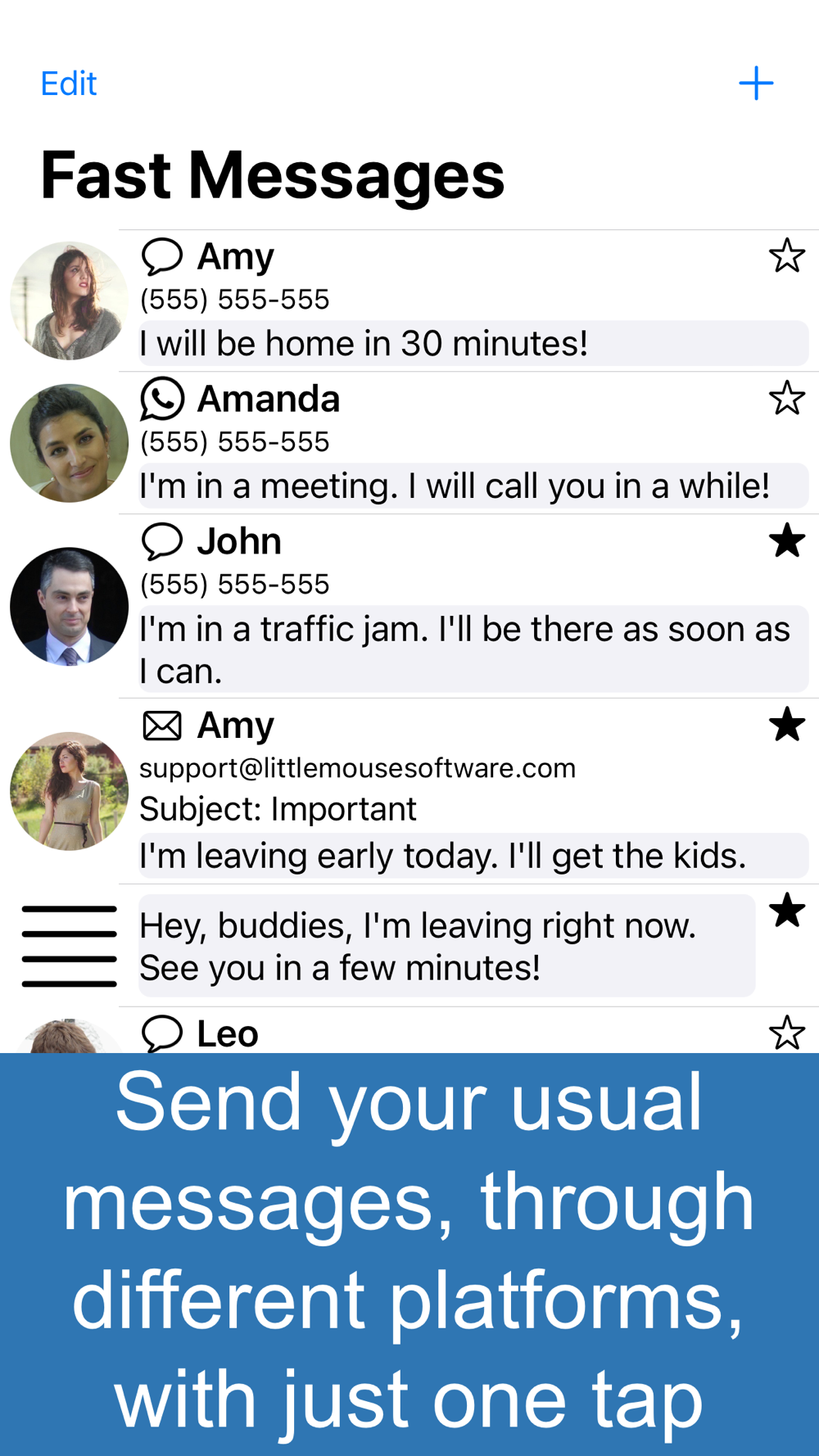 Write them once and send them with just one tap as many times as you like, through WhatsApp, Messages, E-Mail and other platforms.
