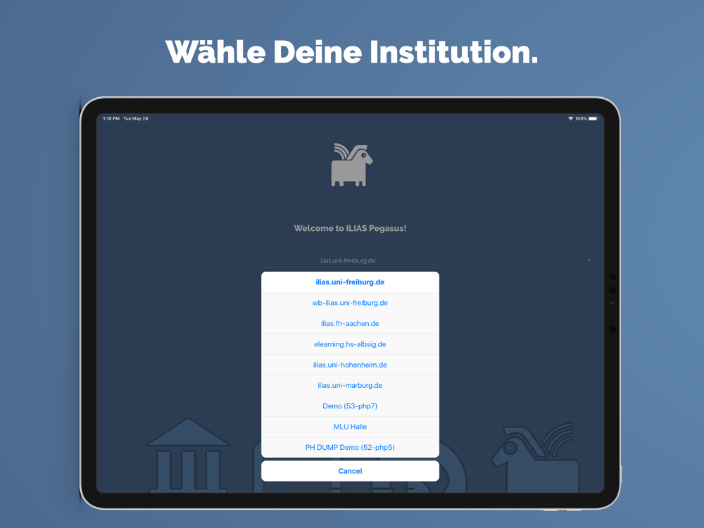 Logge dich einfach mit deinen ILIAS- Nutzerdaten der teilnehmenden Institutionen bei der ILIAS Peagsus App ein und los geht’s!