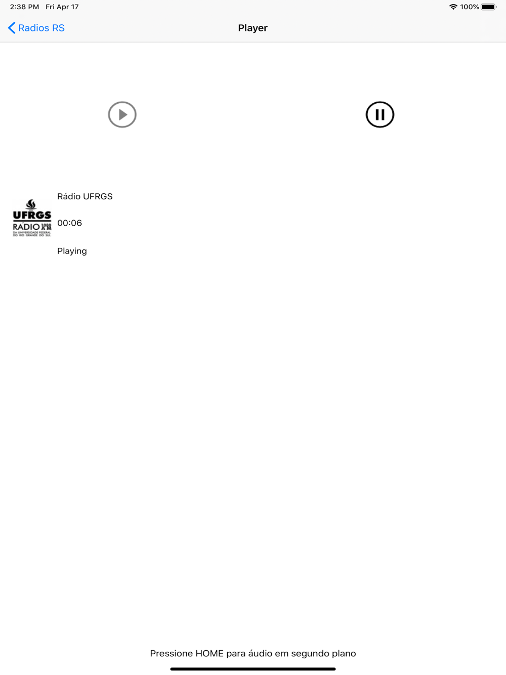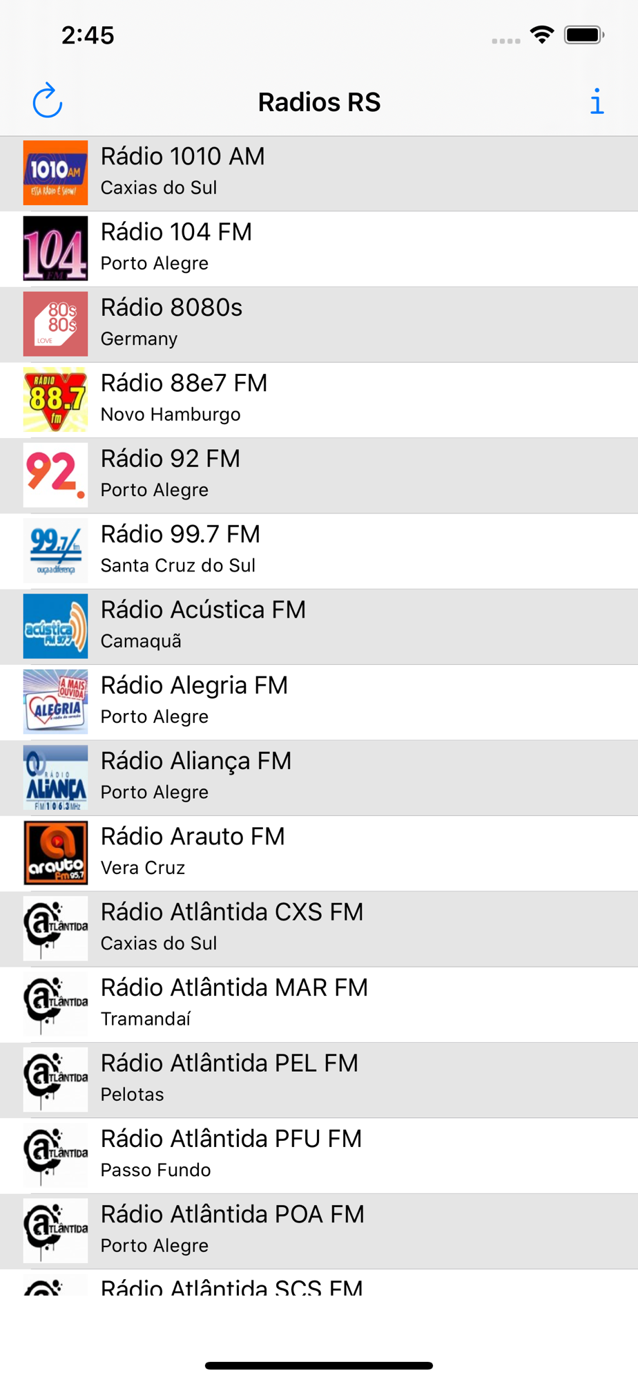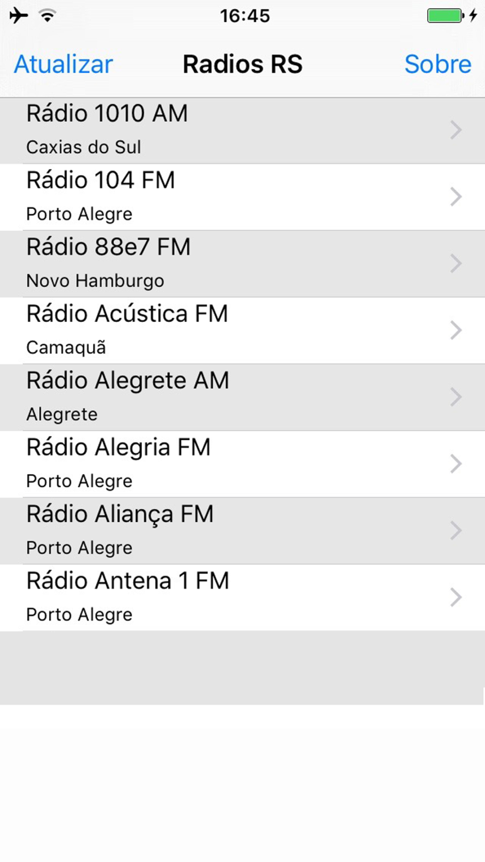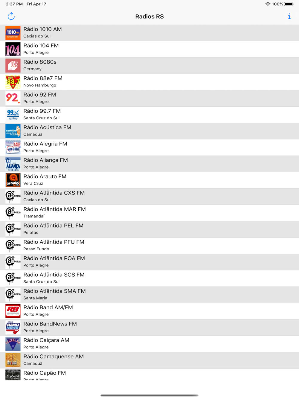 Rádios do Rio Grande do Sul - Brasil: Rádio GRENAL, Guaíba, Itapema, Ipanema, Jovem Pan, Atlântida, Cidade, Farroupilha, Liberdade, Pampa, Continental, Eldorado, Praia, 104 FM, Caiçara, Princesa, UFRGS, Alegria, União, Difusão, Mundial, Arauto, Pop Rock, Band AM, Germânia, Imperial, Nativa, Gazeta, Universidade Pelotas, Rádio Mix 107.1 FM, Oi FM, 88.7, Rede Mais Nova, Medianeira, Imembui, Lider, Jacui, Sobradinho, Sorriso, Tupanci, entre outras. Requer internet para conexão das rádios! Podem ocorrer instabilidades nos servidores das emissoras. A linguagem desse aplicativo é português-Brasil.