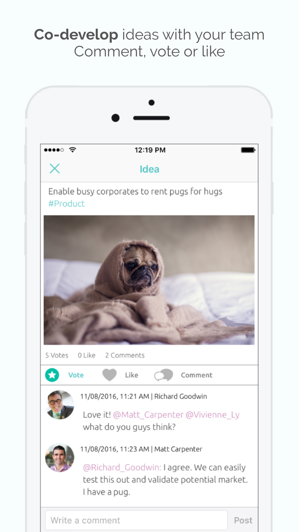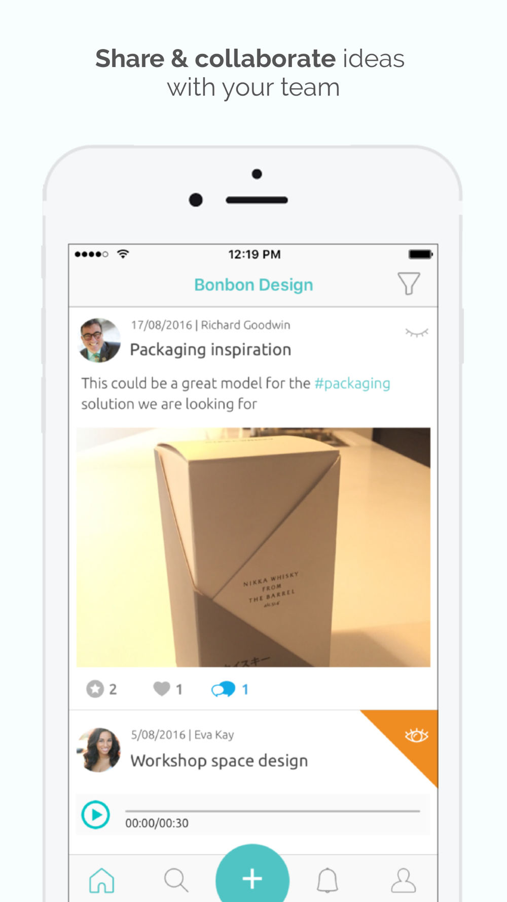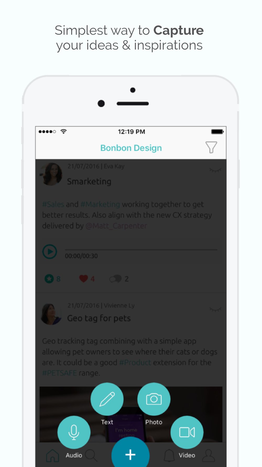 The simplest way to capture ideas and collaborate with your team. Fast track your ideas to execution! Regardless of where you are or what inspired you, at the click of a button, you can capture ideas by photo, audio, video or text, and start collaborating with people you trust straight away. You can also use # to group ideas or @ to mention someone. Team members can collaborate through comments, and express their opinions by like or vote.