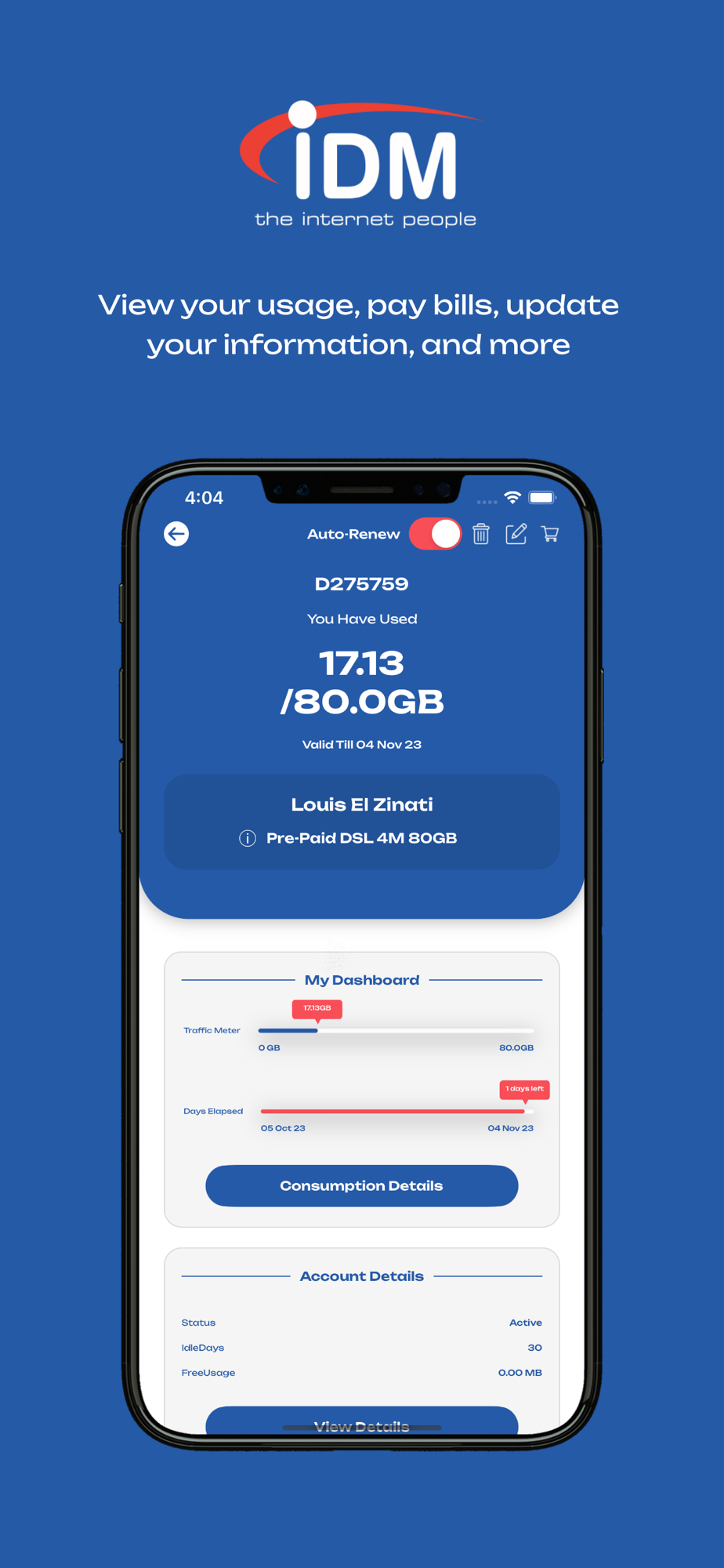 Mobile app allowing IDM users to manage multiple accounts & renew services