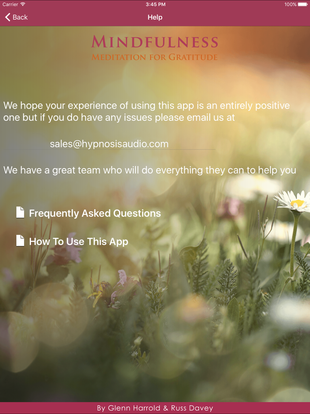 This mindfulness meditation app by Glenn Harrold has been designed to help you develop a very positive mind-set and a love of life. The carefully scripted guided meditation and progressive depth of this recording will help you develop a deep feeling of gratitude and abundance.