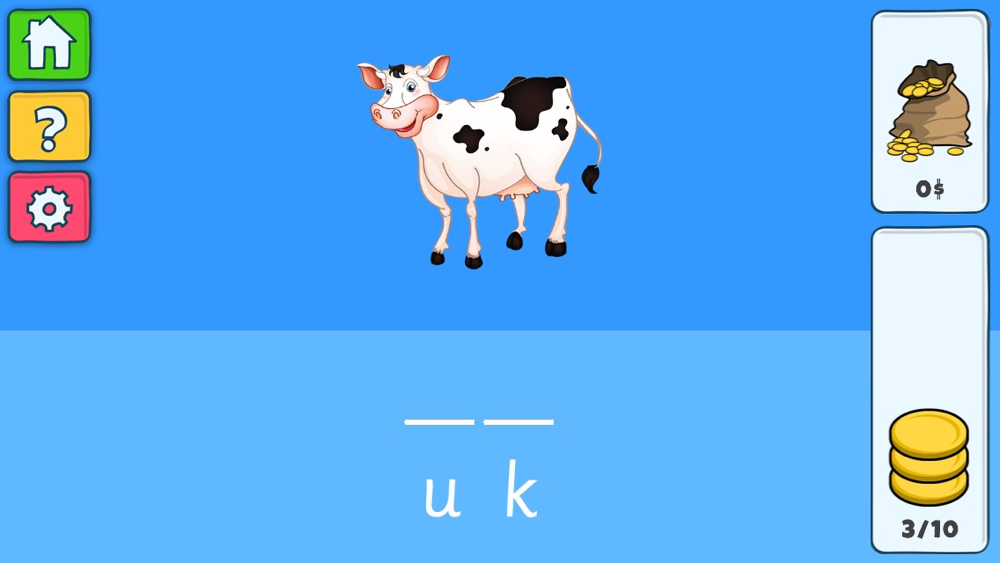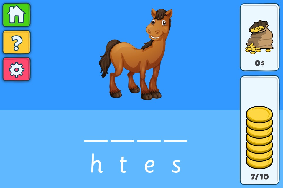 Ved å trykke på figuren, får man høre ordet som skal staves. Man kan også høre bokstavlydene ved å trykke på hver enkel bokstav. Dra så bokstavene i riktig rekkefølge til de tomme linjene under figuren for å stave ordet.