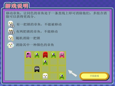 这么多可爱的小章鱼,该怎么把它们消去呢?好像至少四个相同颜色的小章鱼相连才能消去哦,快来试试看吧!