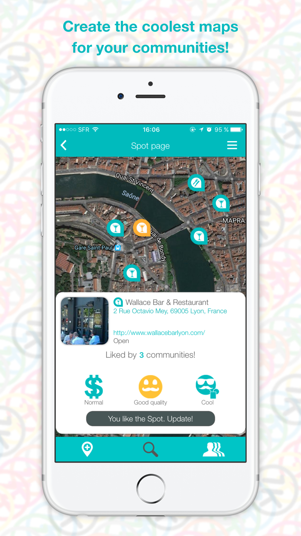 With Maptain, you’ll be able to find relevant spots suggested by qualified communities. Create your own communities and easily share your favorite spots with your friends or people with the same tastes !