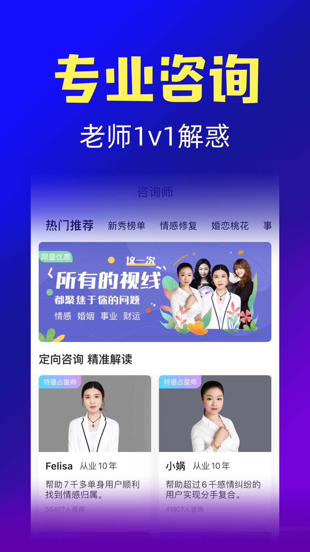 上万专业占星师、心理咨询师24小时私密一对一语音通话服务;实时分析解答用户的情感问题,帮您快速的决断心中疑惑,给出专业建议。